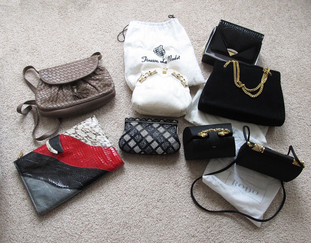 8 GOOD PURSES: Featuring the La Model reptile skin with rhinestone snake clasp, the interior with mirror and comb. Also a Lisette patent and croc clutch with chain handle in original box, Coblentz black Perma suede clutch with chain, 2 Rodo evening purses one with lion heads clasp, and an Italian Leather School soft woven purse.