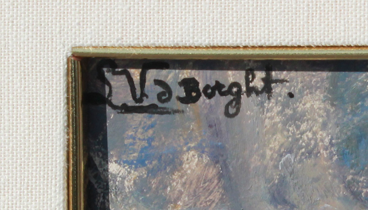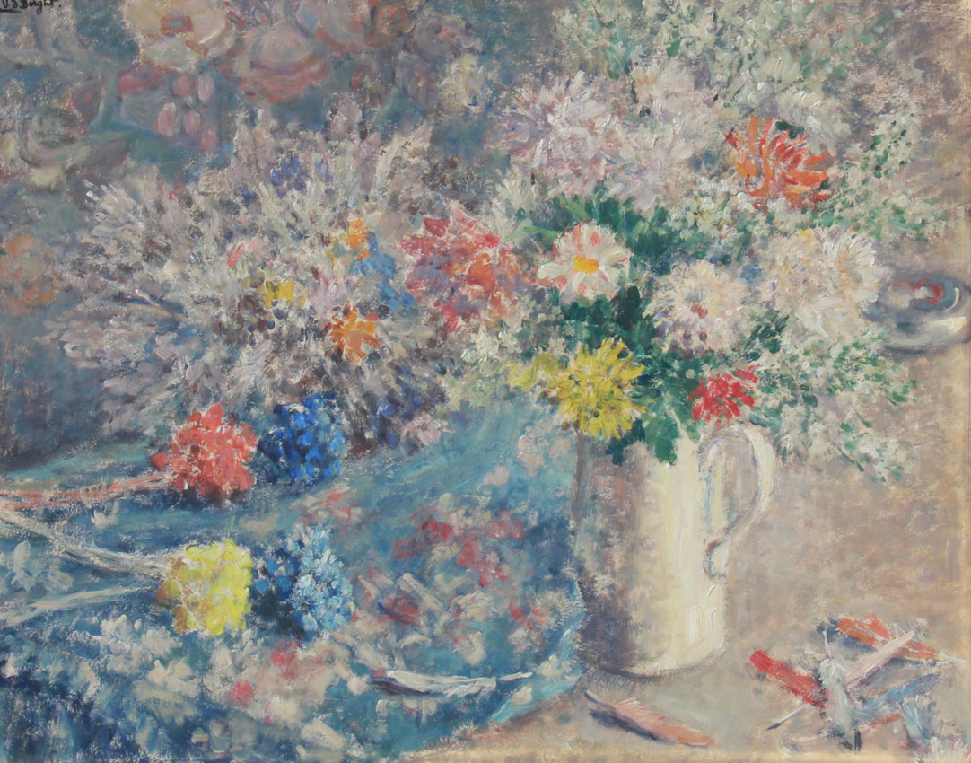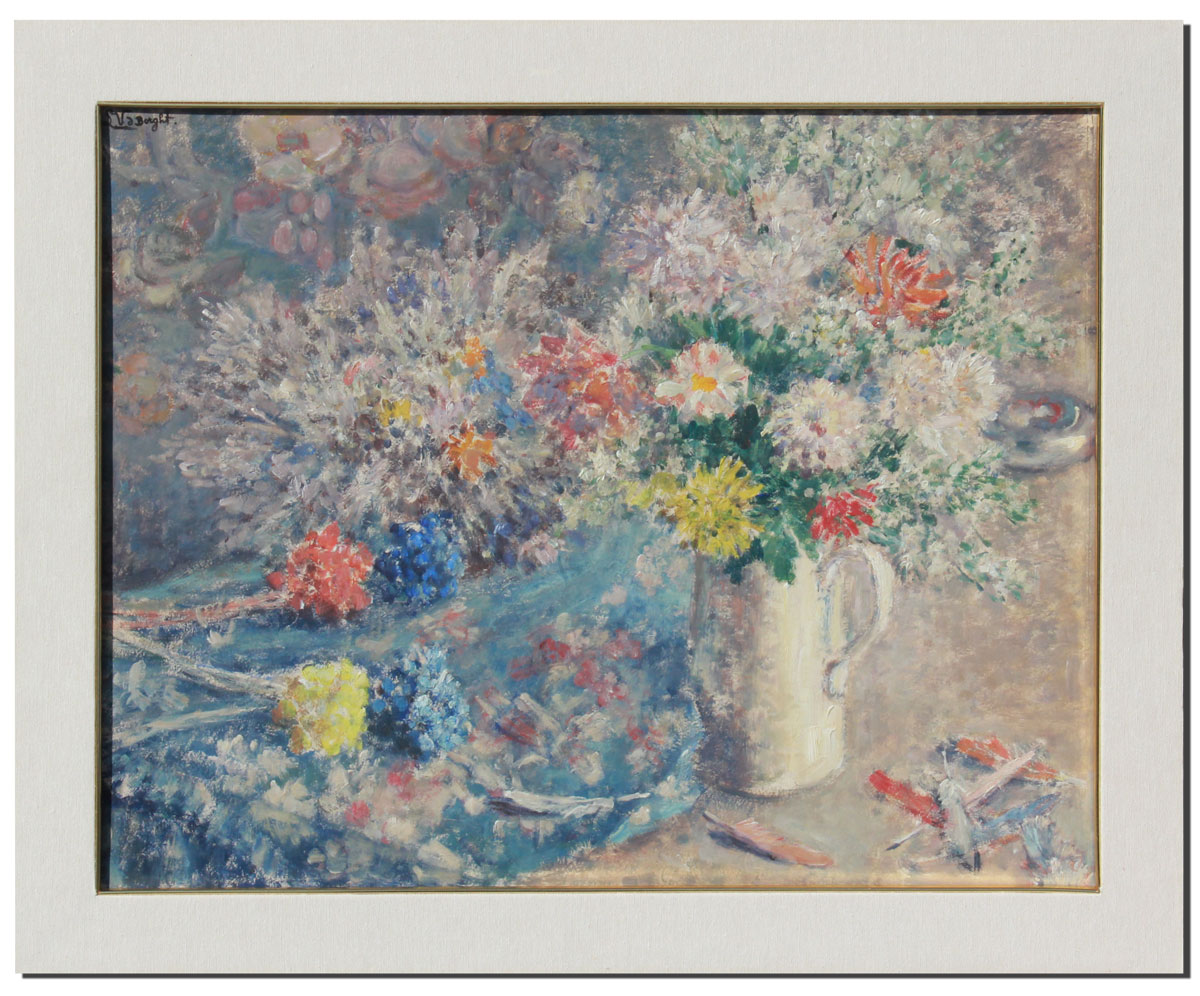 EXCEPTIONAL IMPRESSIONIST STILL LIFE PAINTING ILLEGIBLY SIGNED VAN DE BORGHT: Oil/Paper, Sight size, 25 1/2'' x 20'', illegibly signed upper left, framed, 29 1/2'' x 35''.
