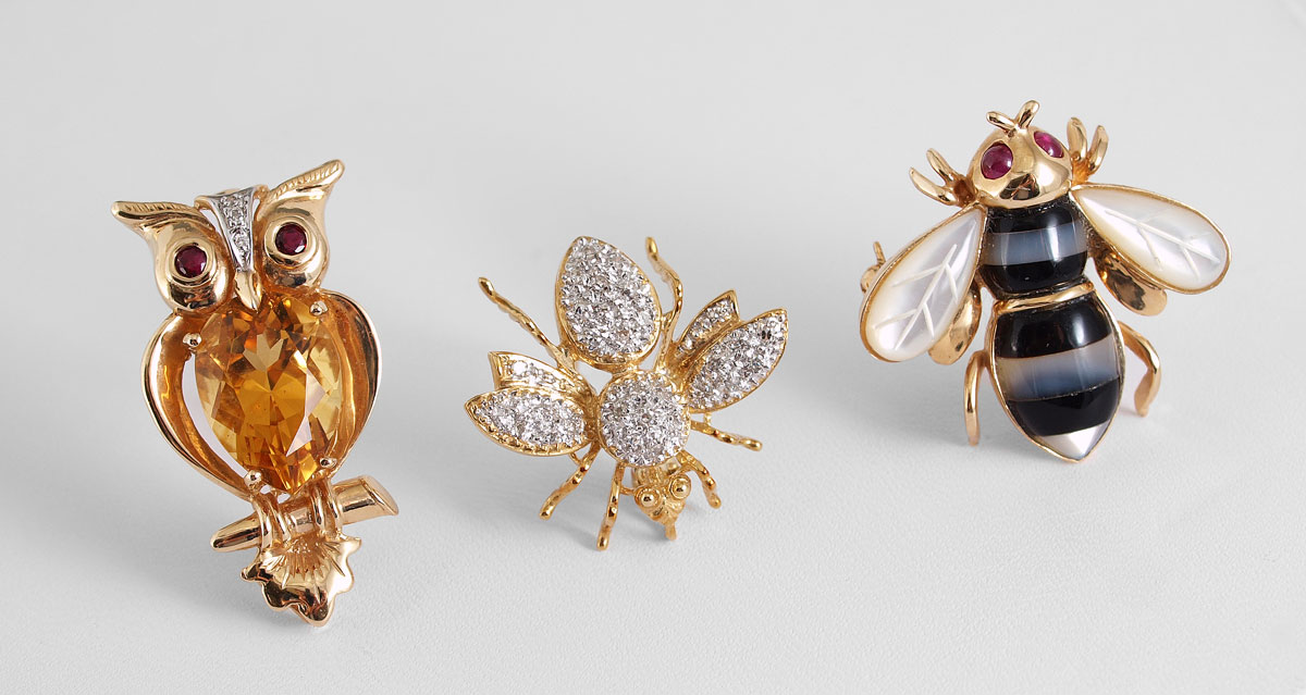 3 GOLD PINS - OWL, FLY AND BUMBLE BEE: The owl has a citrine body, ruby eyes and diamonds between his eyes. The fly is diamond encrusted and the bee has mother of pearl, ruby and onyx. Total diamond weight approx. .25 Ct. All pins have locking bar pin closures. Weight: 12.3 grams.