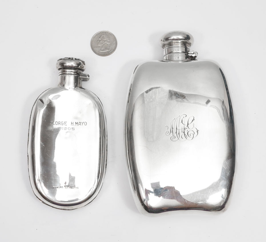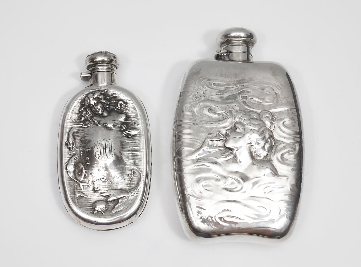 ART NOUVEAU STERLING SILVER FLASKS: To include; 1) Smoking woman, Unger Bros., 6 1/4'' x 3 3/4'', monogrammed; 2) Mermaid with underwater scene, Reddall & Co., Inc. 8.7 troy oz. Both monogrammed.