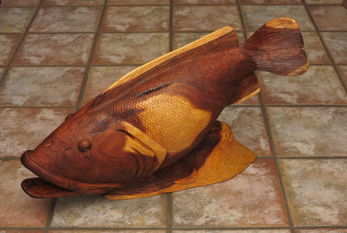 LIFE SIZE CARVED WOOD GROUPER: With nice detail to carving and scales, measures 18'' h. x 30 1/2'' x 7 1/2''. Unsigned. One of your last chances to ''catch'' a grouper this year.