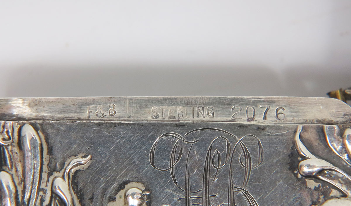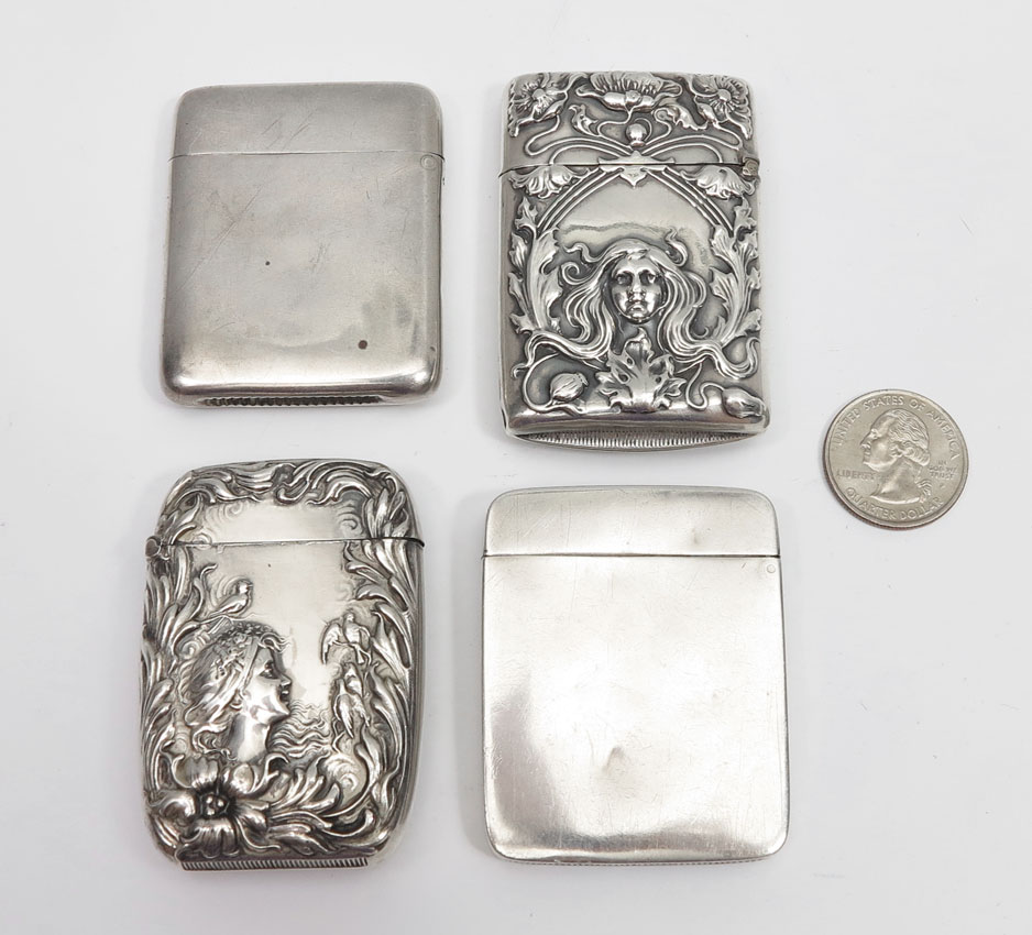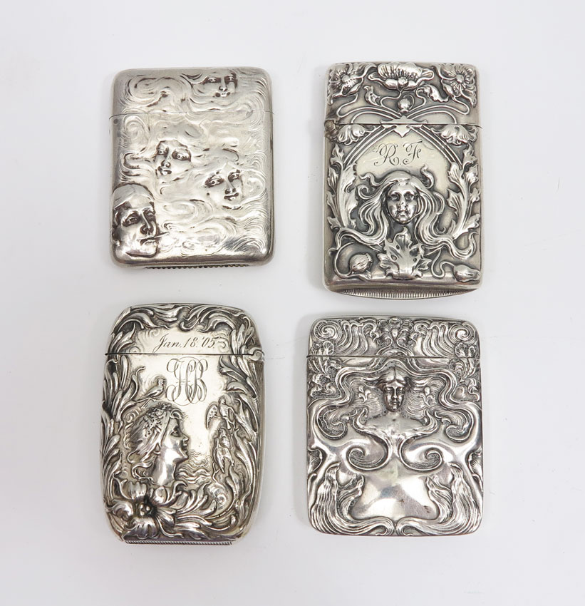 ART NOUVEAU STERLING SILVER MATCH SAFES: To include 1) 4 faces amid swirls, Blackinton marked inside lip; 2) Woman's face amid swirls, unique shape, unidentified mark (F? in a shield); 3) Woman's right bust, looking at bird, Foster & Bailey; and 4) Woman's forward looking face below, marked sterling. 3.8 Troy oz.