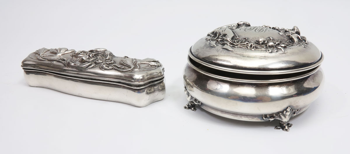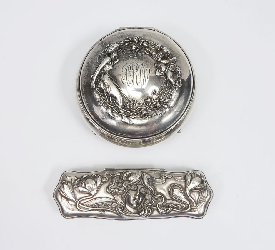 ART NOUVEAU STERLING SILVER JEWELRY CASES: To include; 2 Kerr jewelry case, one rectangular, woman in the middle; and the other circular, woman to left, cupid to right, monogrammed, 2'' h x 4 1/4''. Approx. 7.6 troy oz.