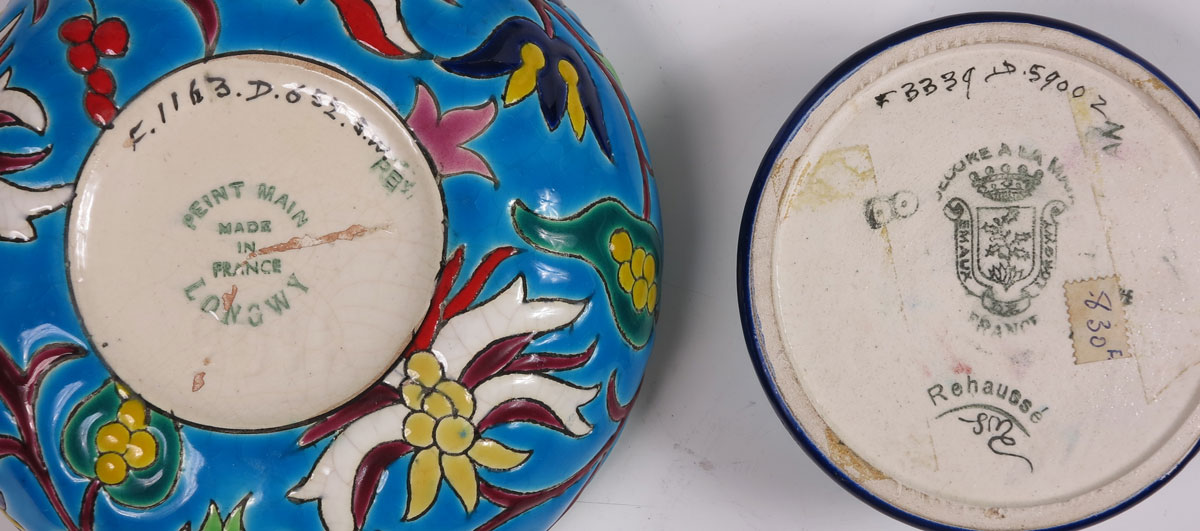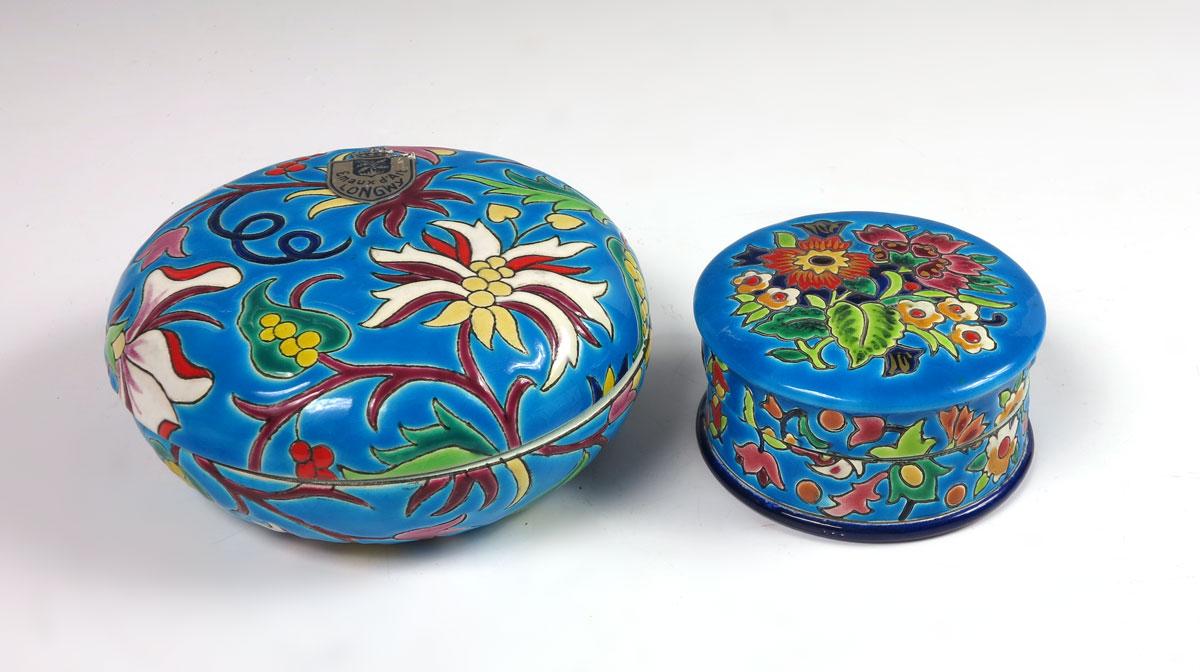2 PIECE LONGWY POTTERY COVERED JARS: To include 1) Circular jar with floral motif, marked Longwy with additional paper label on top. 2 1/2'' x 5 1/2''. 2) Smaller circular jar, marked Longwy, 2'' h. x 3 3/4''.
