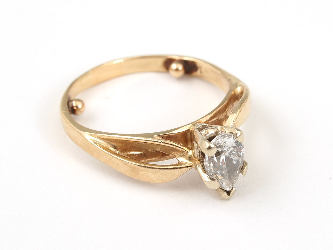 .60 CT PEAR DIAMOND ENGAGEMENT RING: 14K yellow gold ring centers 1 round pear shaped cut diamond. Weight: .60 Ct. Approx. Rated SI2 in clarity and J in color. The diamond is prong set. Weight: 2.8 grams. Size: 6