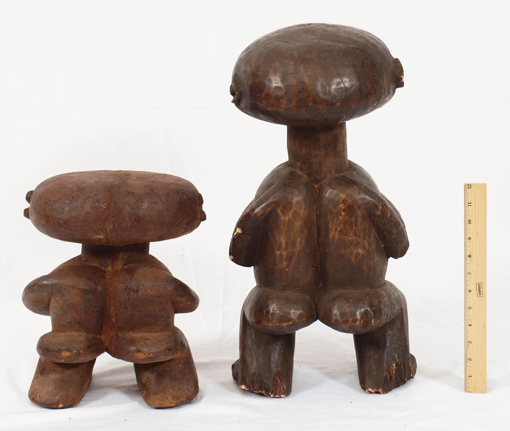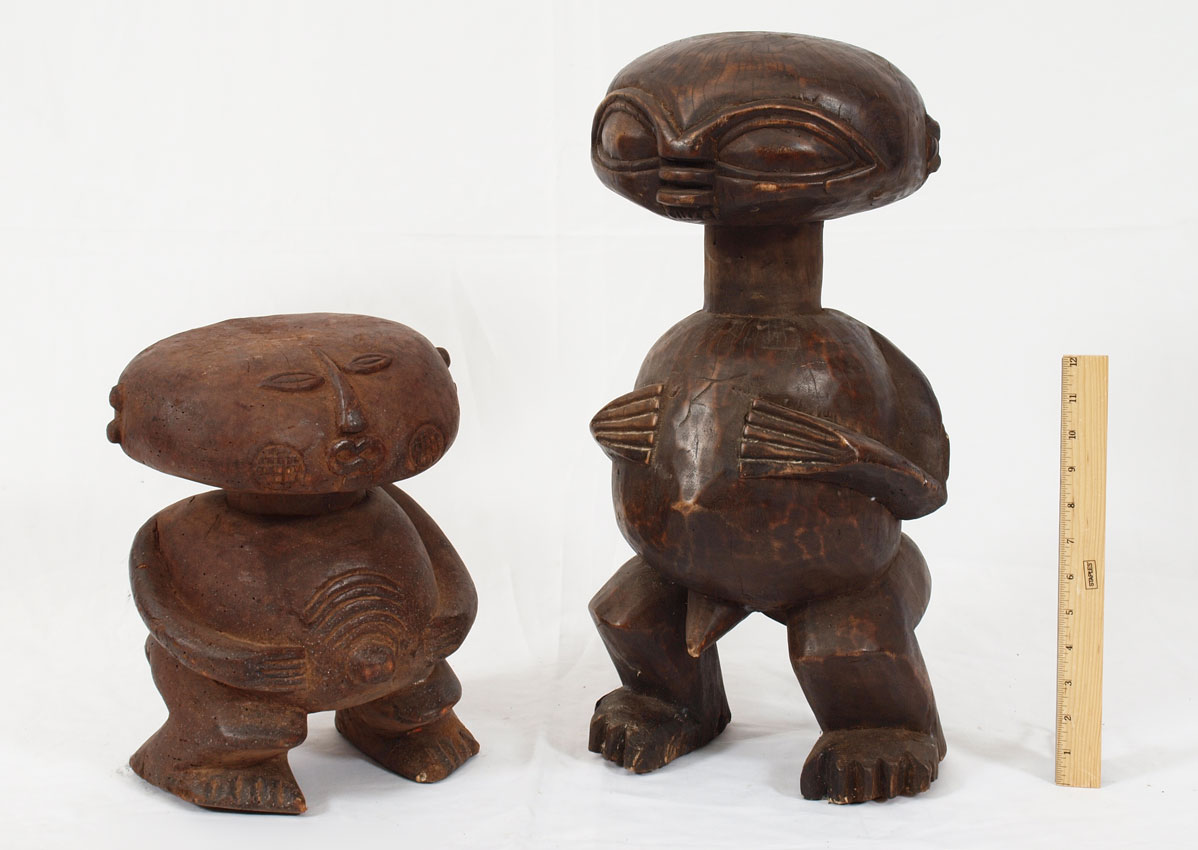 PAIR CARVED PYGMY FIGURES: 13'' x 11'' x 9'', 5.5 lbs. & 21'' x 11'' x 9'', 13.5 lbs.