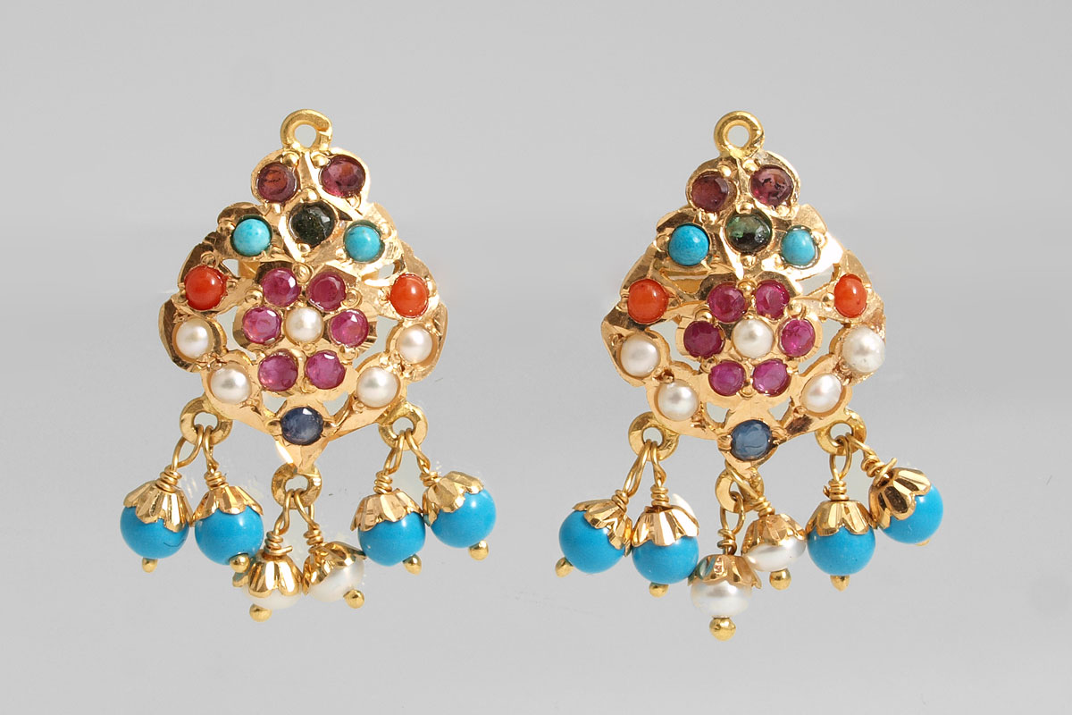 22K GOLD MULTI GEMSTONE EARRINGS: 22K yellow gold chandelier style earrings contain seed pearls, rubies, turquoise, coral and tourmaline. Threaded post and nut closures. Length 1''. Weight: 4.8 grams.