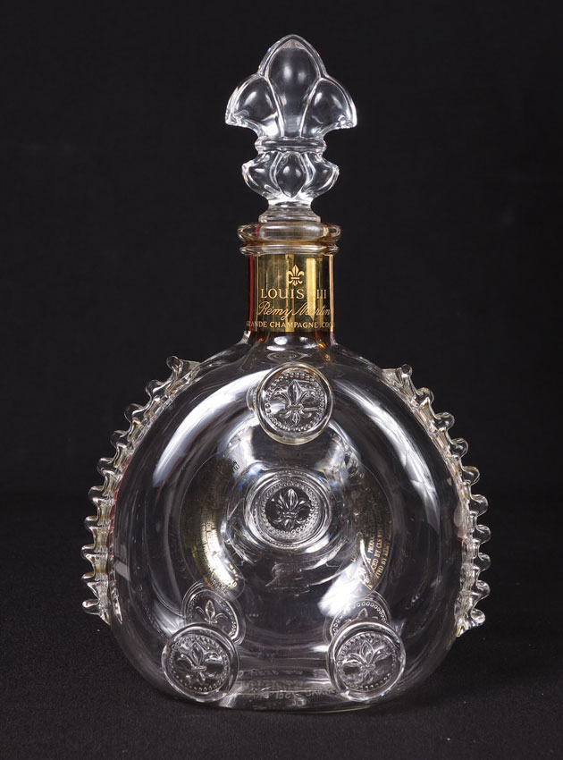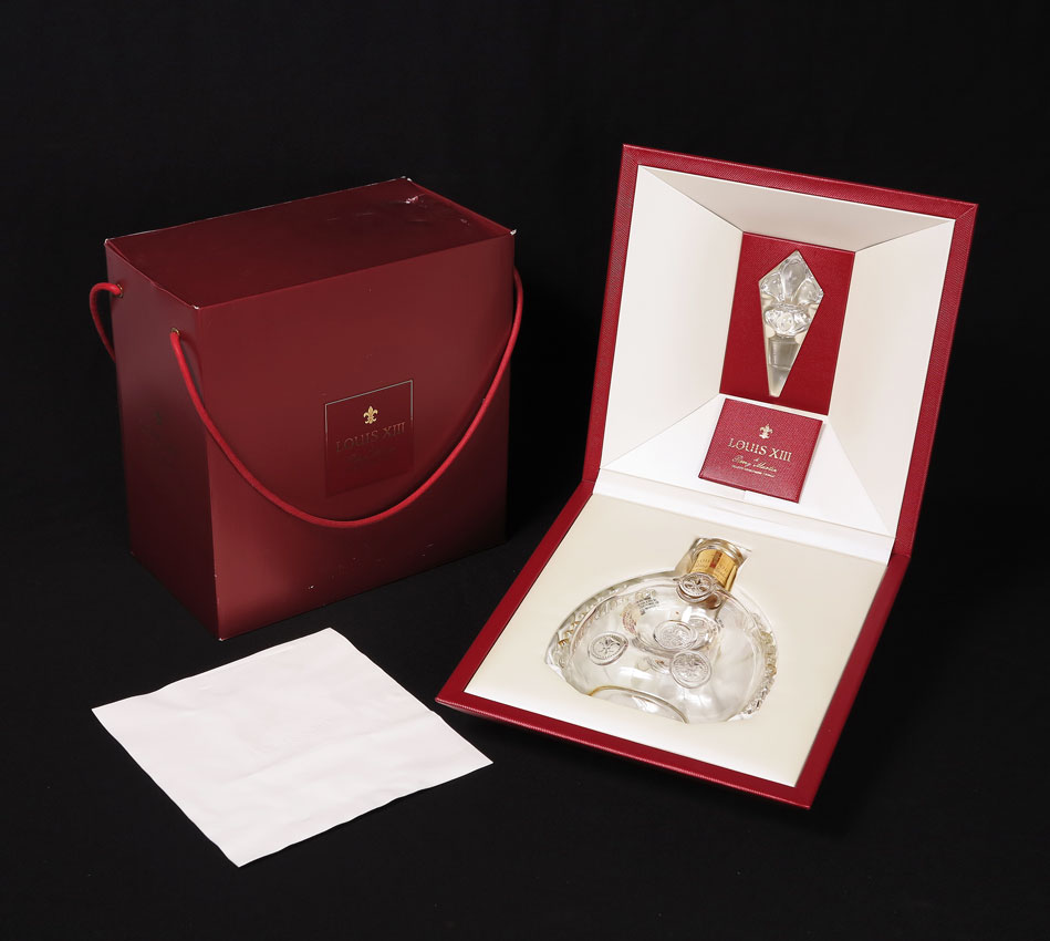LOUIS XIII REMY MARTIN BOTTLE IN ORIGINAL BOX: Baccarat for Remy Martin bottle with fleur de lis stopper, original box, carrying case and certificate. Carafe number CV 8280. Carrying case measures 11 1/4'' h. x 12 1/4'' x 6 3/4''.