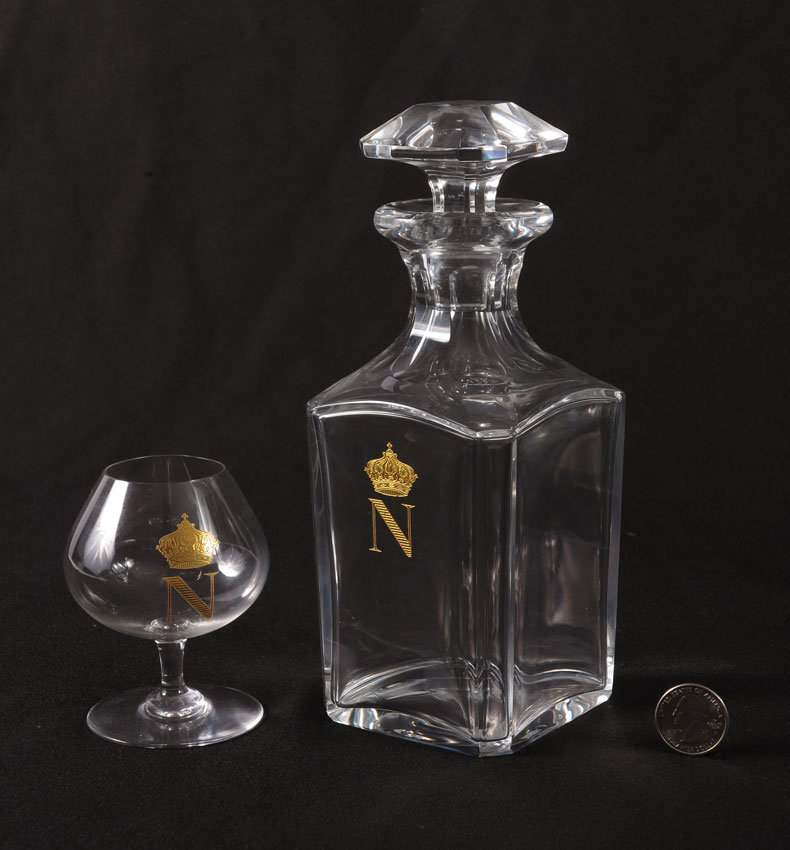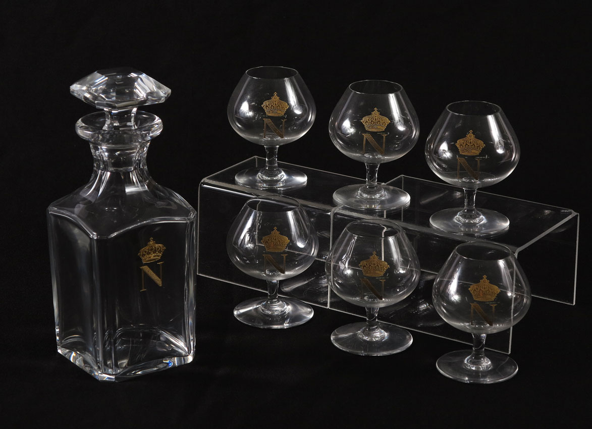 BACCARAT FRENCH CRYSTAL DECANTER & 6 BRANDY STEMS: Each piece with a gold crown and N embossed decoration. The glasses are signed Baccarat. Decanter with stopper measures 8'' tall, the glasses, 3 3/4''.