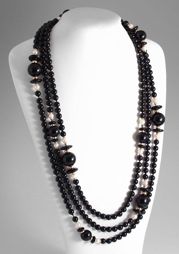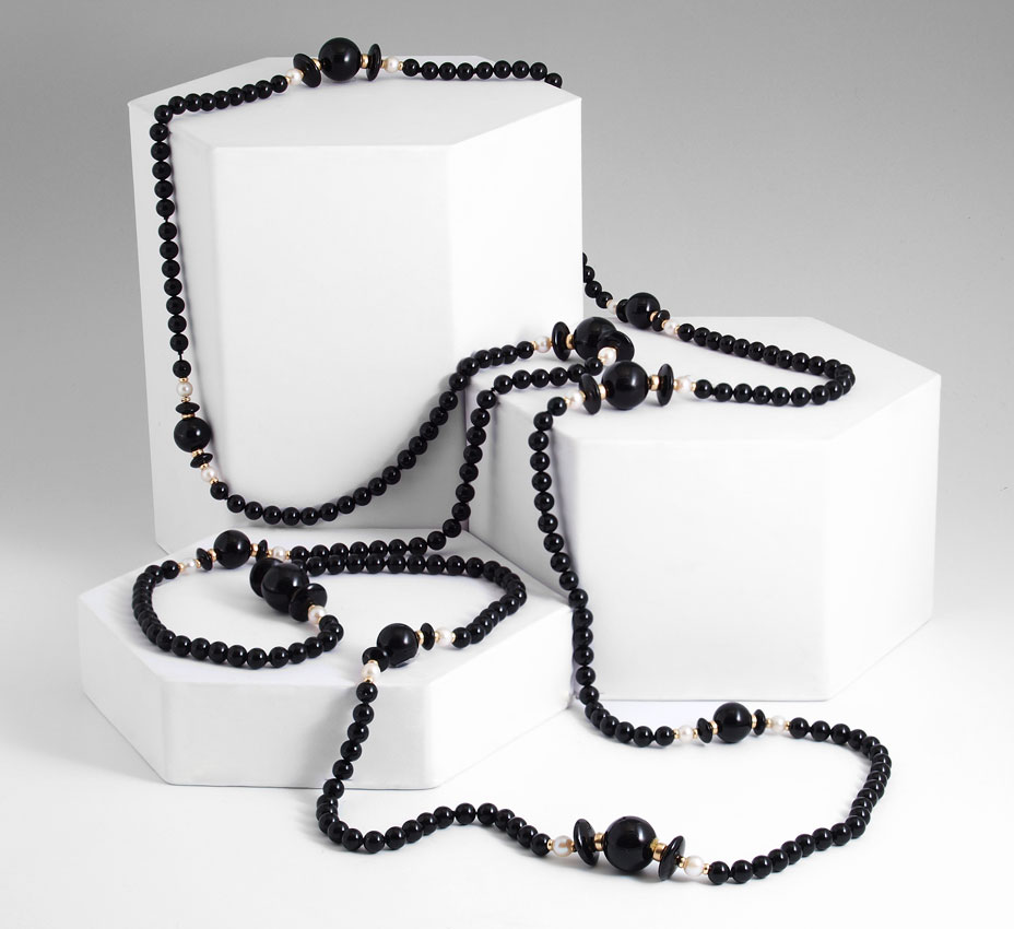 ONYX AND PEARL NECKLACE: Necklace of black onyx beads and discs. Cultured pearls of unknown origin and gold filled space beads. Length: 70''.