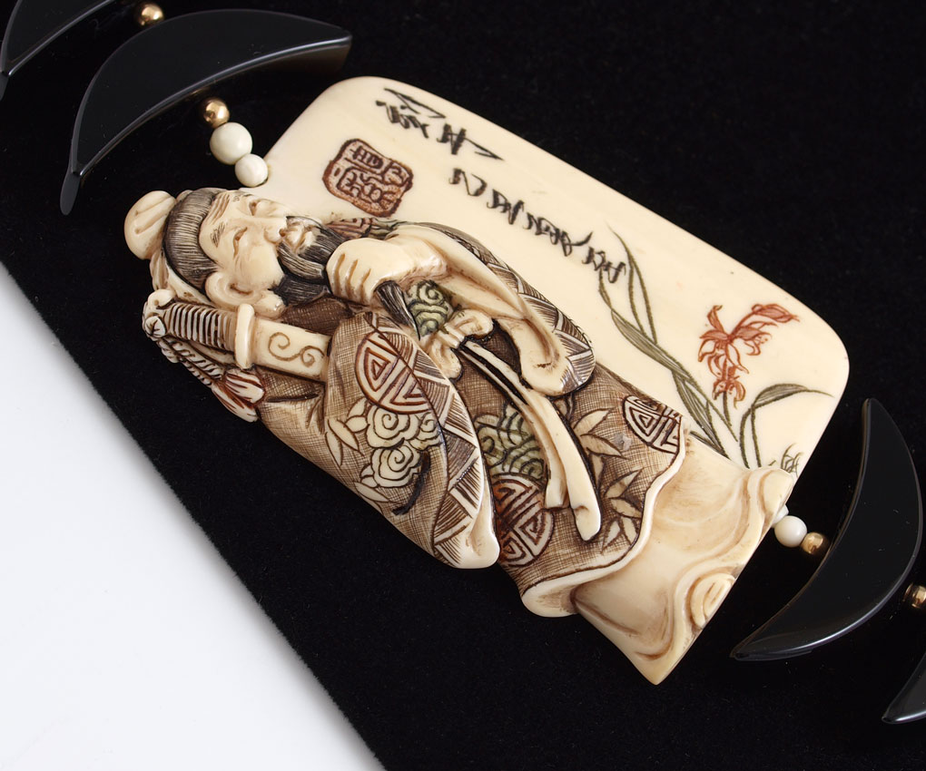 ONYX AND IVORY NECKLACE: Necklace of black onyx beads, crescent shaped tablets, and discs. Ivory bead and gold filled bead spacers and spring ring. Carved ivory 2.5'' okimono figure. Length: 34''
