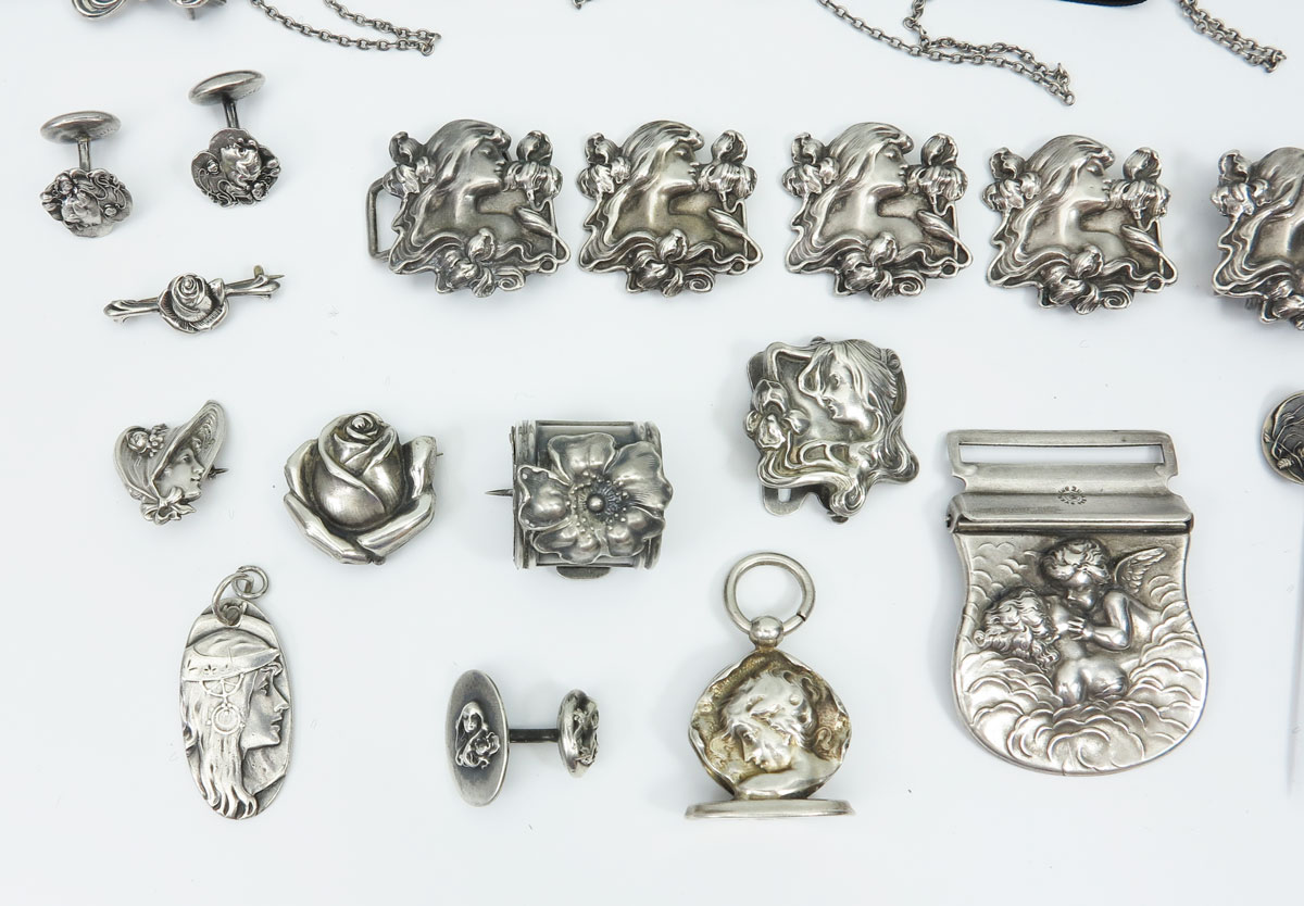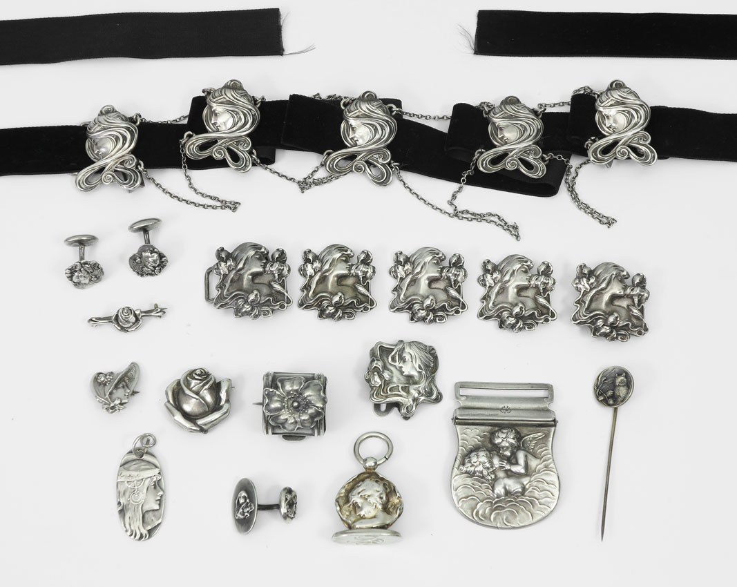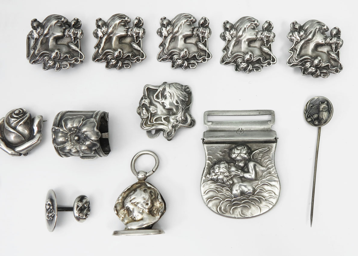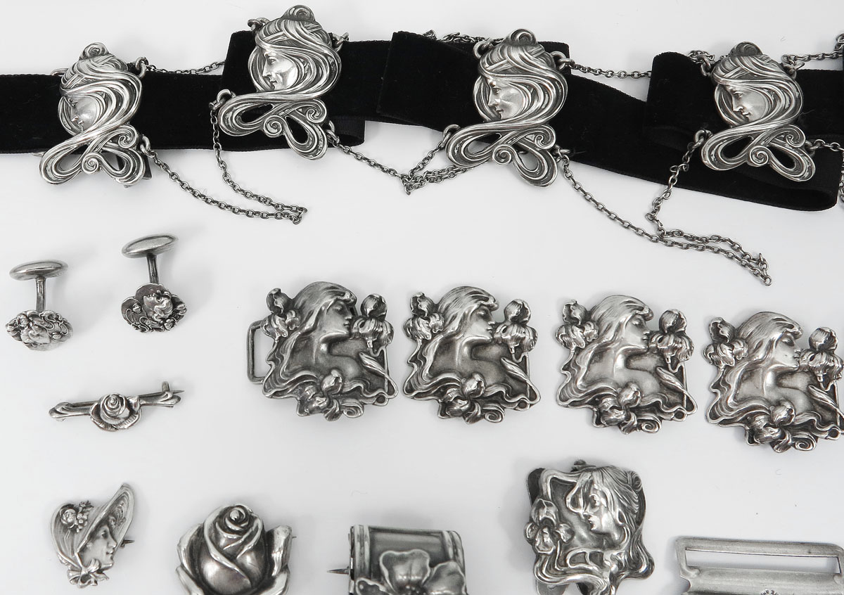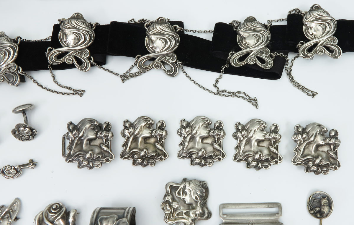 ART NOUVEAU STERLING SILVER JEWELRY: To include; 1) Belt set, 5 pieces; 2) Belt (marked underside of one of the buckles & under cloth - hard to find) mounted on a replacement? cloth ribbon; 3) Watch fob, nouveau/Mucha lady, 1.25 inches top to bottom; 4) Clip, Love's Dream; 5) Clip, woman's left profile; 5) Rose watch pin; 6) Bonnet lady pin; 7) Very small rose pin; 8) Cufflinks, pair and single, 3 pieces; 9) Scent pin with original sponge (very rare); sponge was soaked in mild cologne and pinned to a woman's blouse/dress; 10) Owl stick pin; and 11) Seal.