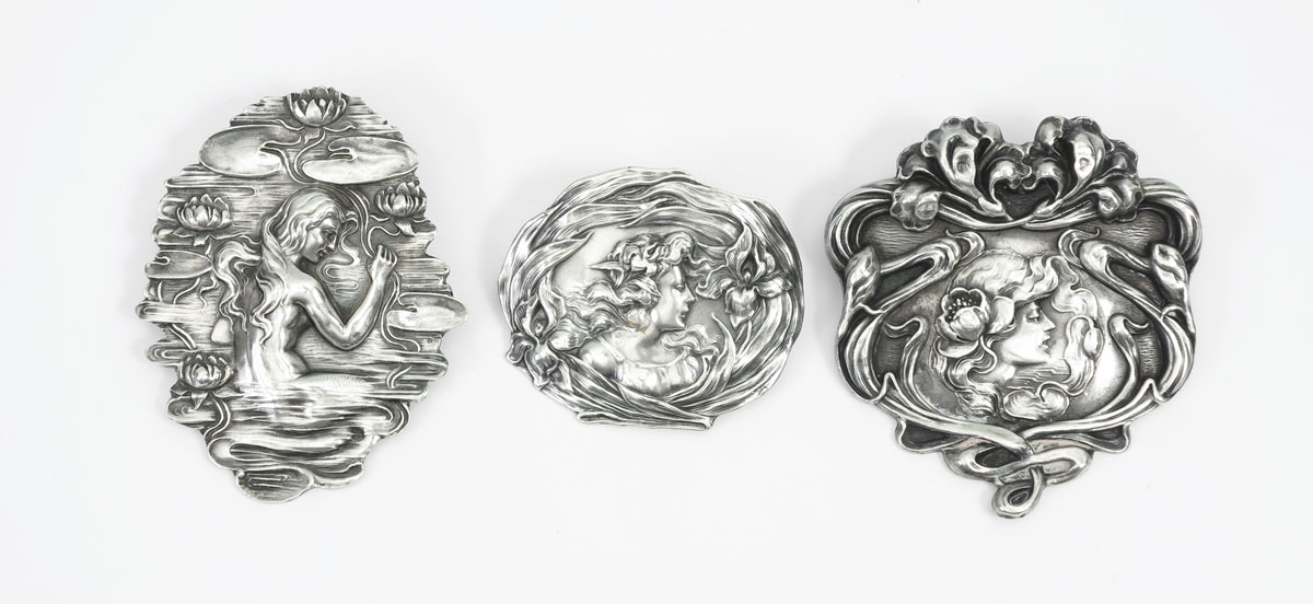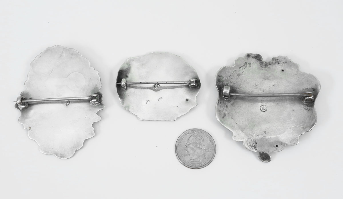UNGER BROTHERS ART NOUVEAU STERLING SILVER PINS: To include; 1) Pin, right profile of woman's bust in center, 2 inches; 2) Pin, right profile of woman's face, 2.5 inches 3) Pin, Woman in a pond with water lily, 2.75 inches, top to bottom. All by Unger Brothers. 2.0 Troy oz.