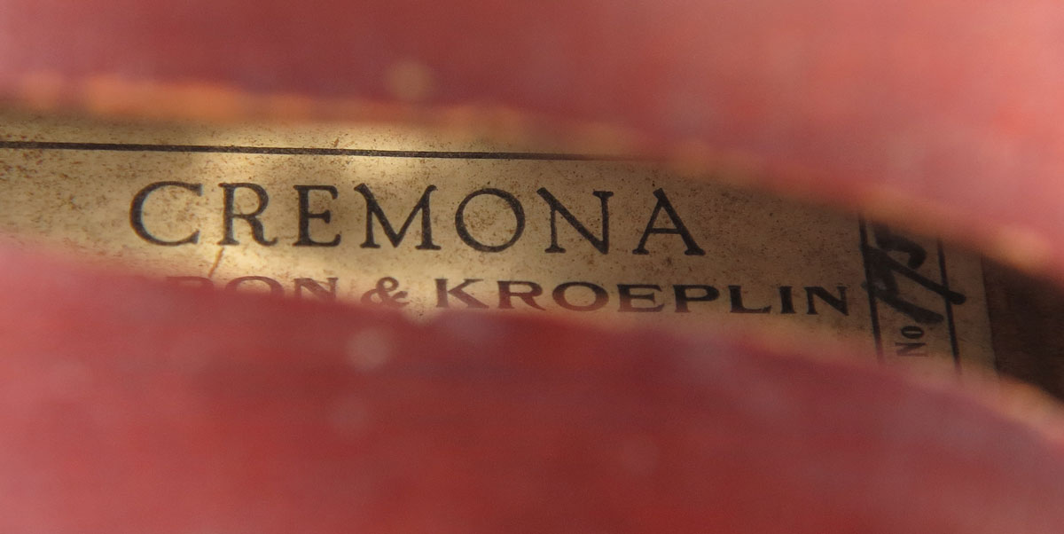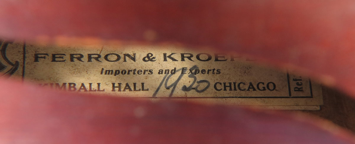 1920 GERMAN CREMONA VIOLIN: Label reads Cremona, Ferron & Kroplin, Importers & Experts, Kimball Hall 1920 Chicago. 14'' single panel back, 24'' overall. Sold with an A. Schroetter bow and unmarked bow, hard case 4 3/4'' x 31 1/2'' x 10''.