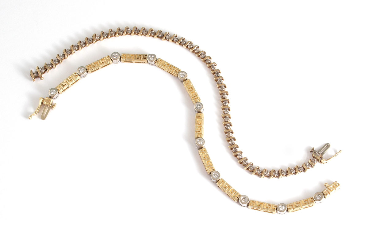 2 DIAMOND TENNIS BRACELETS: 1) 14K yellow gold Greek key design contains 11 round brilliant cut diamonds totaling approx. .33 Ct. Rated VS in clarity and H-I in color. 7'' in length. Weight: 14 grams. 2) 10K yellow gold contains 49 round full cut diamonds. Weight: .75 Ct. Approx. Rated I1 in clarity and Top Light Brown in color. Weight: 6.1 grams.
