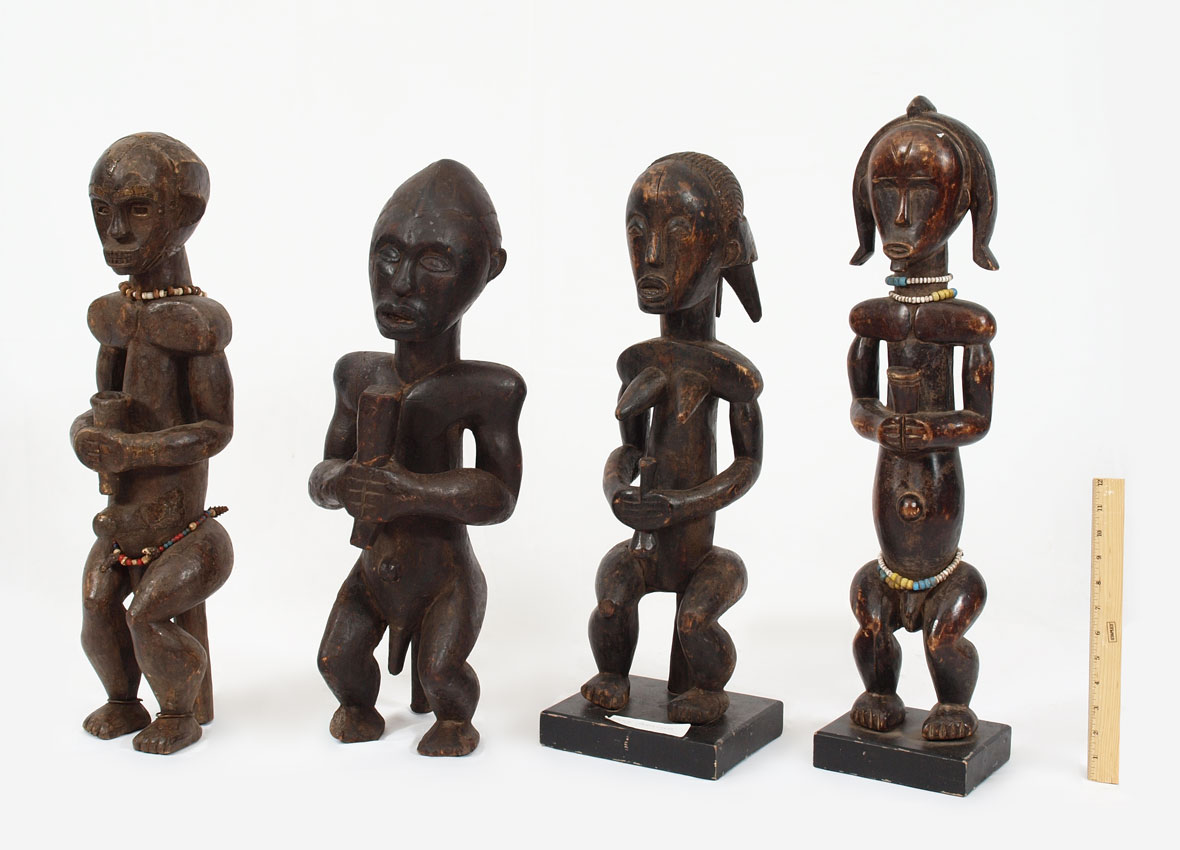 4 CARVED AFRICAN FANG FIGURINES: 27'' x 7'' x 6'', 4.5 lbs., 24'' x 9'' x 7'', 6.5 lbs., 25'' x 6'', 6'', 5 lbs., & 25'' x 8'' x 7'', 6 lbs.