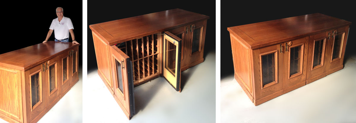 VINOTHEQUE WINE COOLER/CREDENZA: Monterey Classic Style, red oak, locking windowed doors and was purchased through the Wine Enthusiast in 2003. It holds about 240 750-ltr bottles and 12 champagne size bottles and has a thermostat that is inserted into an water-filled bottle to keep temps constant. Interior racking made of red cypress. Dimensions: 72'' long x 36'' high x 32 1/2'' wide. Original owner's manual and other documentation will be sold with the cooler. Original sales price, $5,500.