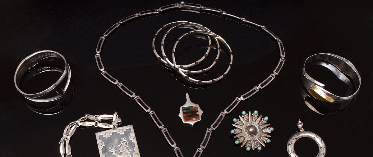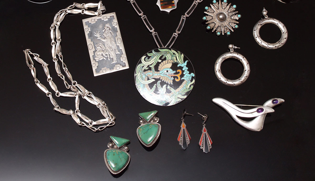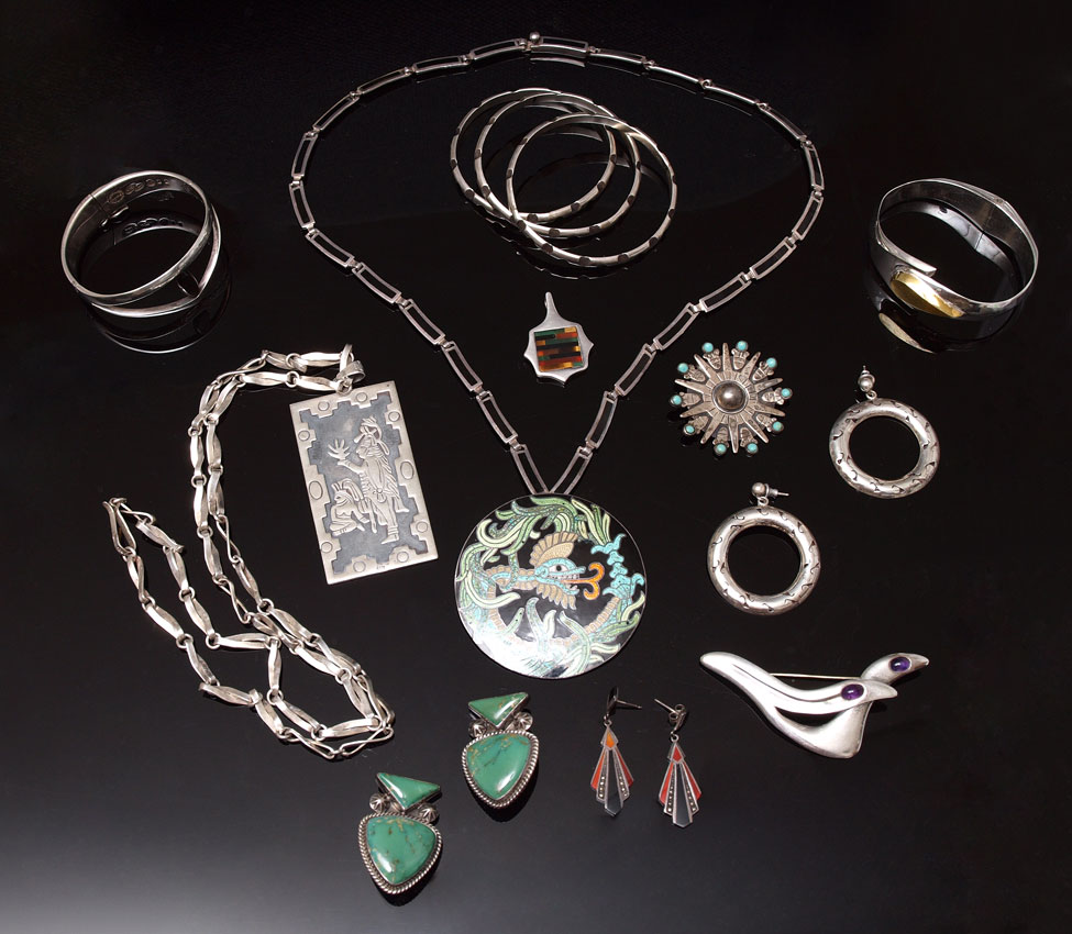TRAY OF MEXICAN STERLING JEWELRY: To include, Sigfrido Pineda hinged bangle bracelet with suspended polished hematite?, 2 1/4'' dia, 1.4 troy oz; Erika Hult de Corral ''RIC'' brooch set with amethyst2 7/8'' x 1 1/4'', .6 troy oz.; Three bangles marked Hilda, attributed to Antonio Pineda, 2 1/2'' dia., 1.8 troy oz.; Pierced post dangle earrings, hollow hoops with carved decoration, marked ACO?, 1 7/8''l., .28 troy oz; Contemporary hinged bangle with brass? decoration, 2'' x 2 1/2'', 1.8 troy oz; Sunburst pin/pendant, set with small turquoise cabochons, 1 3/4''dia.; Margot de Taxco enamel pendant necklace, pendant/brooch with dragon motif 2 1/2''dia., enamel inlaid link necklace approx. 22''l., 3.2 troy oz.; Reversible etched pendant marked MBR? eagle 2, 2 3/4'' x 1 1/2'', on twisted link chain, approx. 28'', 2 troy oz. Sold with Reve sterling and green stone clip earrings by Don & Elizabeth Buck, inlaid pendant from Israel and marcasite and enamel pendant earrings. Sold as a lot.