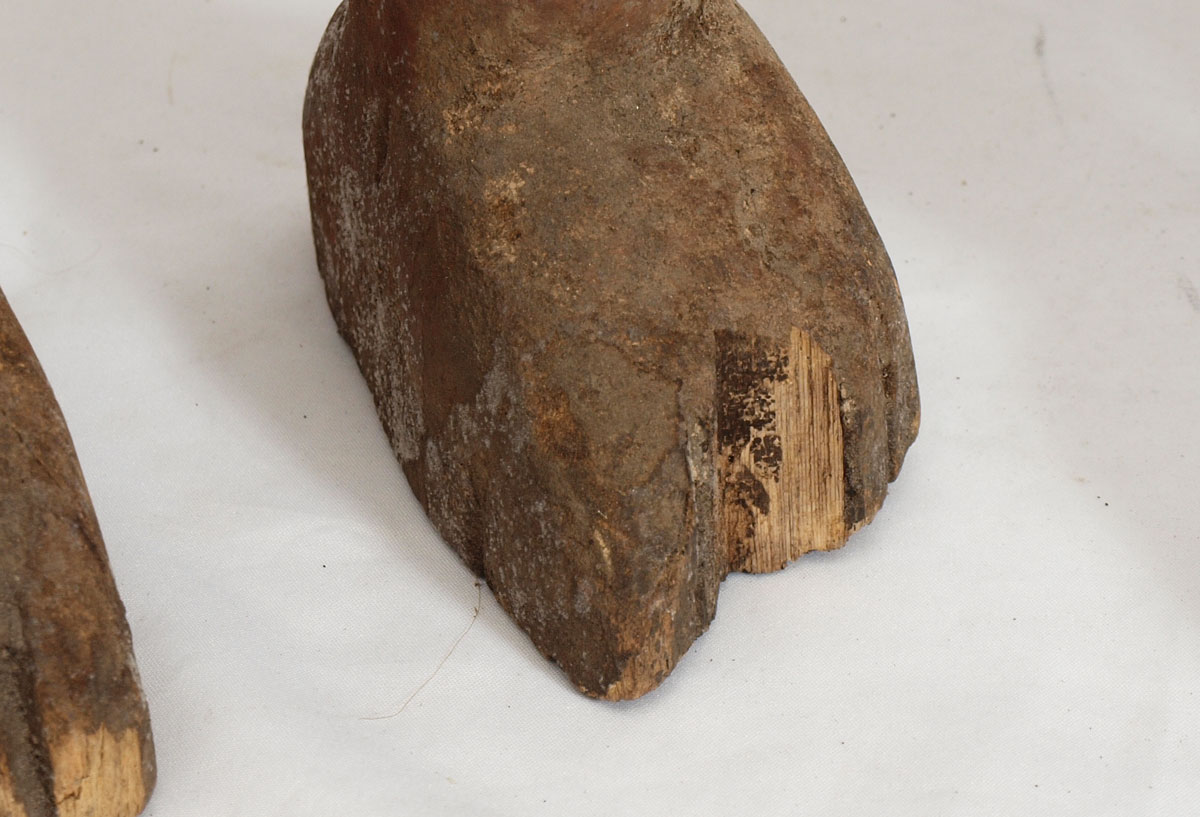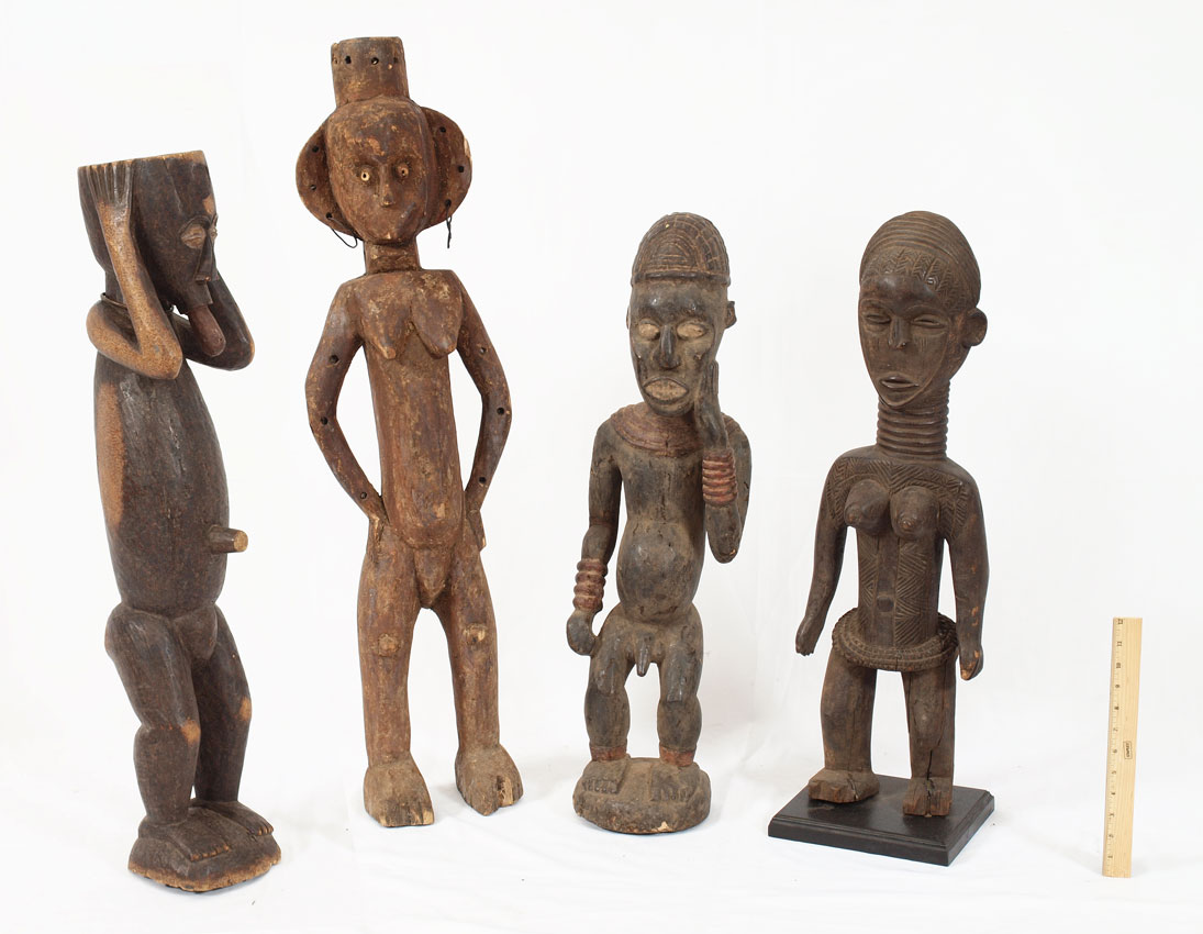 4 MIXED CARVED AFRICAN FIGURES: 29'' x 9'' x 7'', 8.5 lbs., 38'' x 10'' x 9'', 8.5 lbs., 30'' x 10'' x 7'', 12 lbs., & 31'' x 7'' x 7'', 8 lbs.