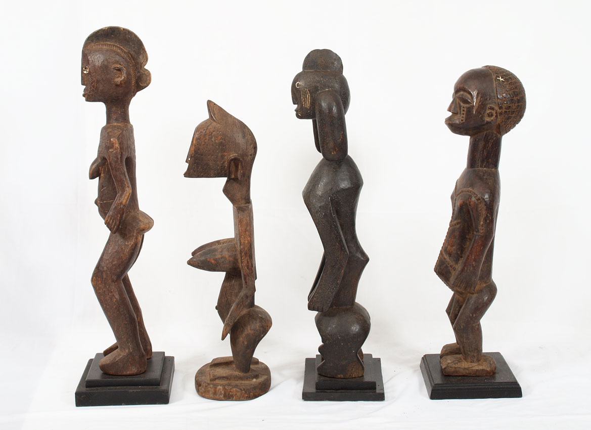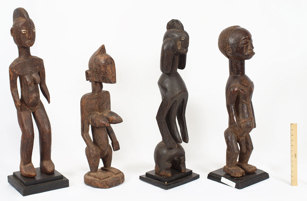 MIXED LOT OF 4 CARVED AFRICAN FIGURES: 35'' x 9'' x 9'', 10 lbs., 21'' x 8'' x 8'', 10.5 lbs., 31'' x 9'' x 9'', 10 lbs., & 32'' x 8'' x 9'', 8.5 lbs.