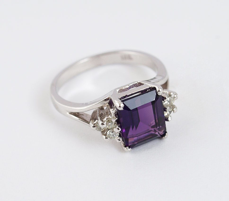 18K AMETHYST & DIAMOND RING: 18K white gold ring contains one emerald cut amethyst. Weight: 2.50 Ct. Approx. 6 round full cut diamonds. Weight: .15 Ct. Approx. Rated SI in clarity and H-I in color. The amethyst and diamonds are prong set. Weight: 4.4 grams. Size: 5.5