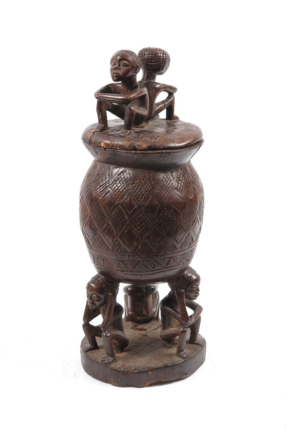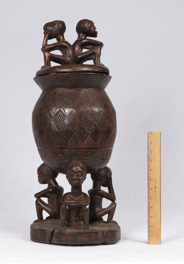 CARVED AFRICAN FIGURAL COVERED BOWL CHOKOIE FROM THE CONGO: 9.5 LBS., 25'' x 9'' x 8''.
