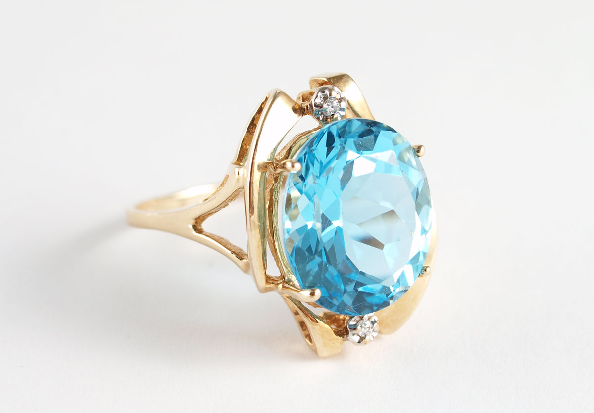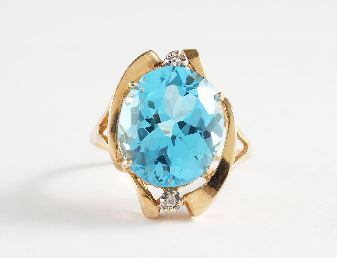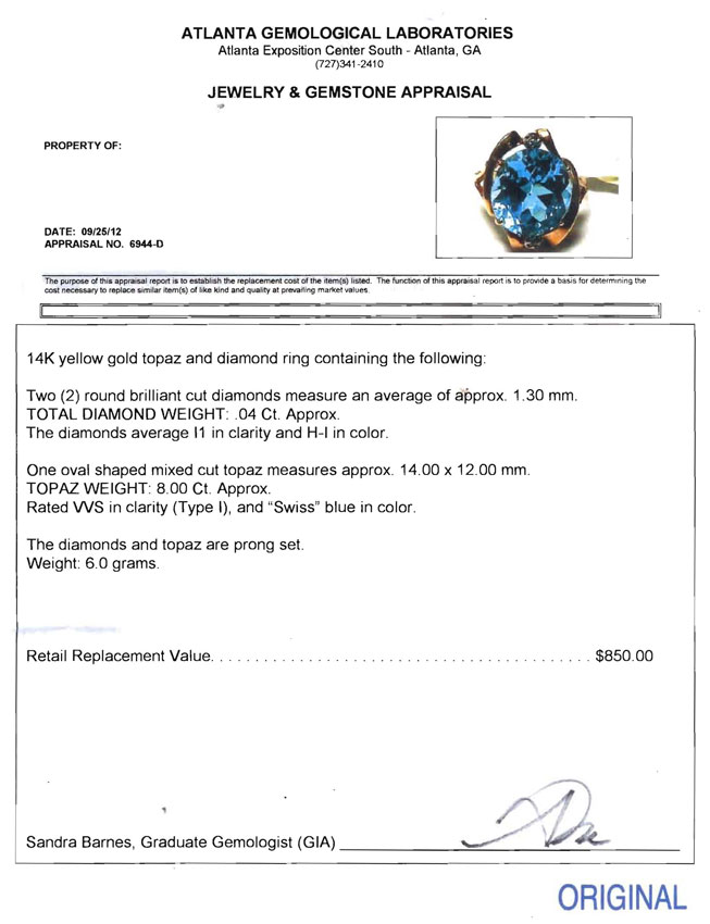 8 CT SWISS BLUE TOPAZ RING WITH DIAMONDS: 14K yellow gold ring with an approx 8 Ct oval mixed cut topaz. The two round brilliant diamonds total approx. .04 Ct. Size 9. Weight 6 grams. Sold with current Atlanta Gemological GIA graduates appraisal for $850.