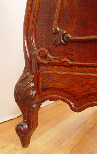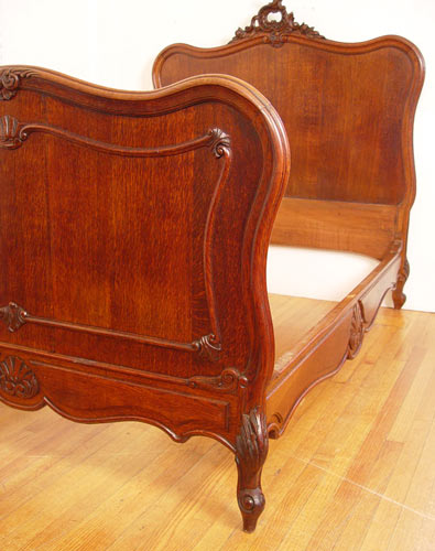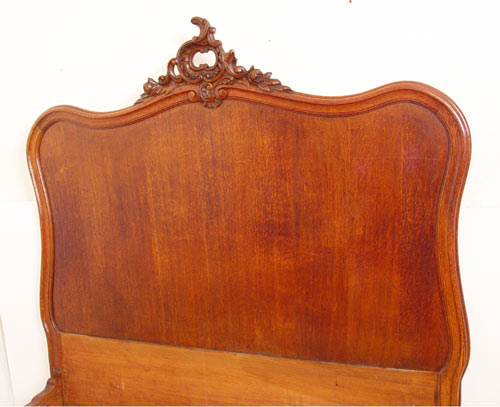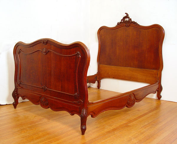 COUNTRY FRENCH CARVED OAK BED: Double size bed stead, the carved headboard measures 62'' high x 57 3/4'' wide. Footboard measures 42'' high.