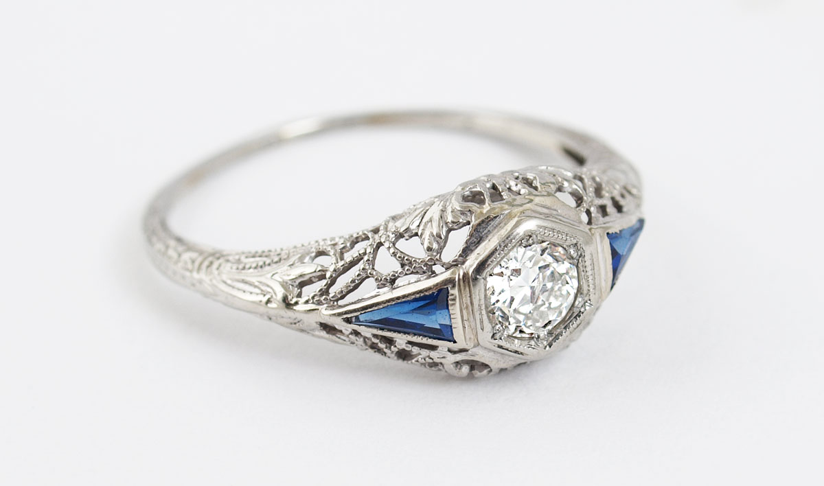 18K DIAMOND FILIGREE RING: 18K white gold ring contains one transitional cut diamond. Weight: .24 Ct. Approx. The diamond is rated SI2 in clarity and G-H in color. Two synthetic sapphires. Weight: 1.4 grams. Size: 6.5