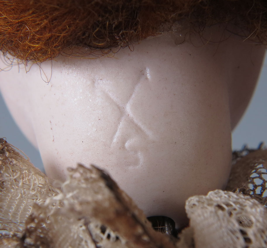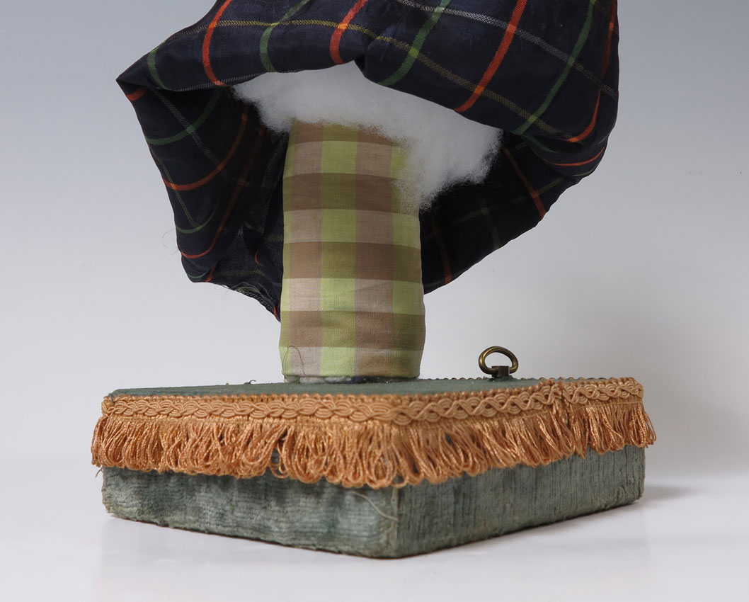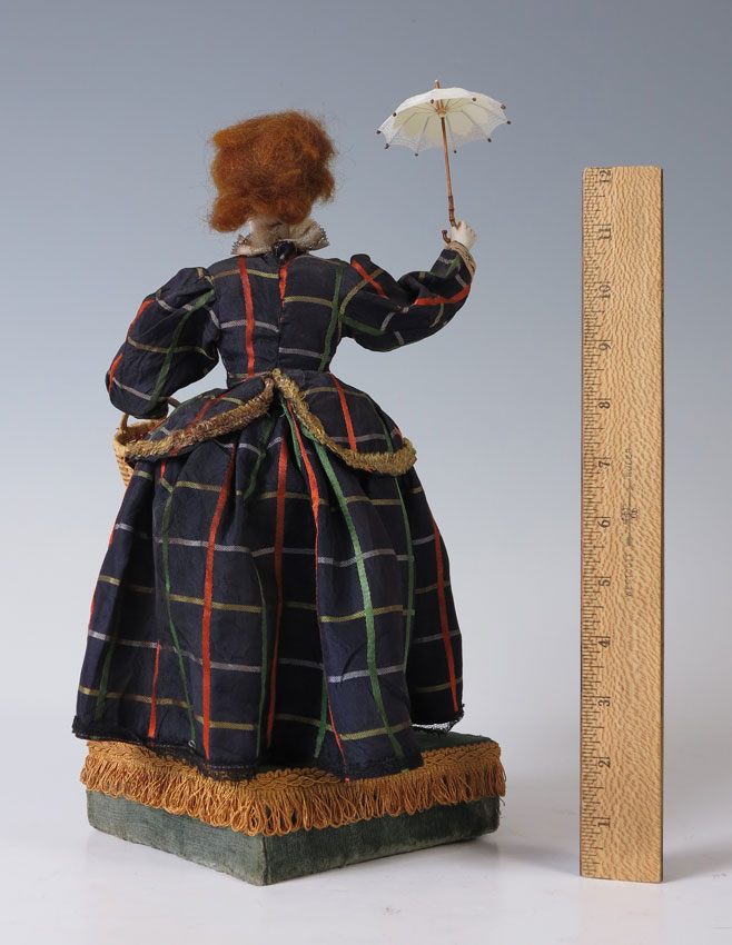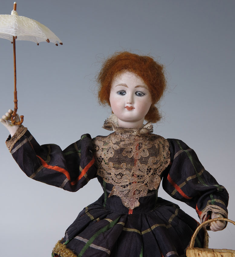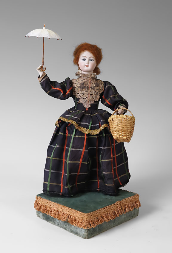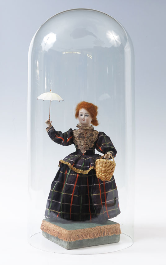 WIND UP MUSICAL AUTOMATON DOLL AND GLASS DOME: Bisque head marked with impressed crossed swords and S, painted facial features. In working order, her head and arms move along with the music. The velvet plinth and her dress do show age. The base measures approx. 6 square, the doll 12'' tall. The glass dome measures approx. 22'' tall x 10'' dia.