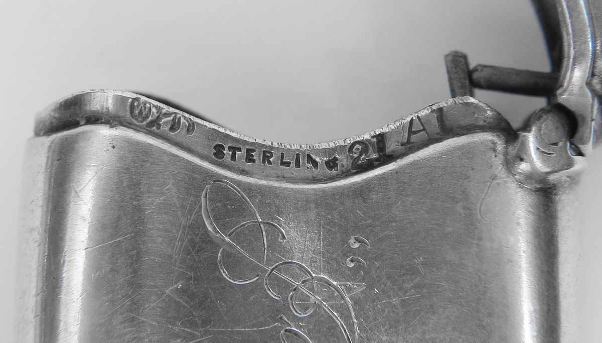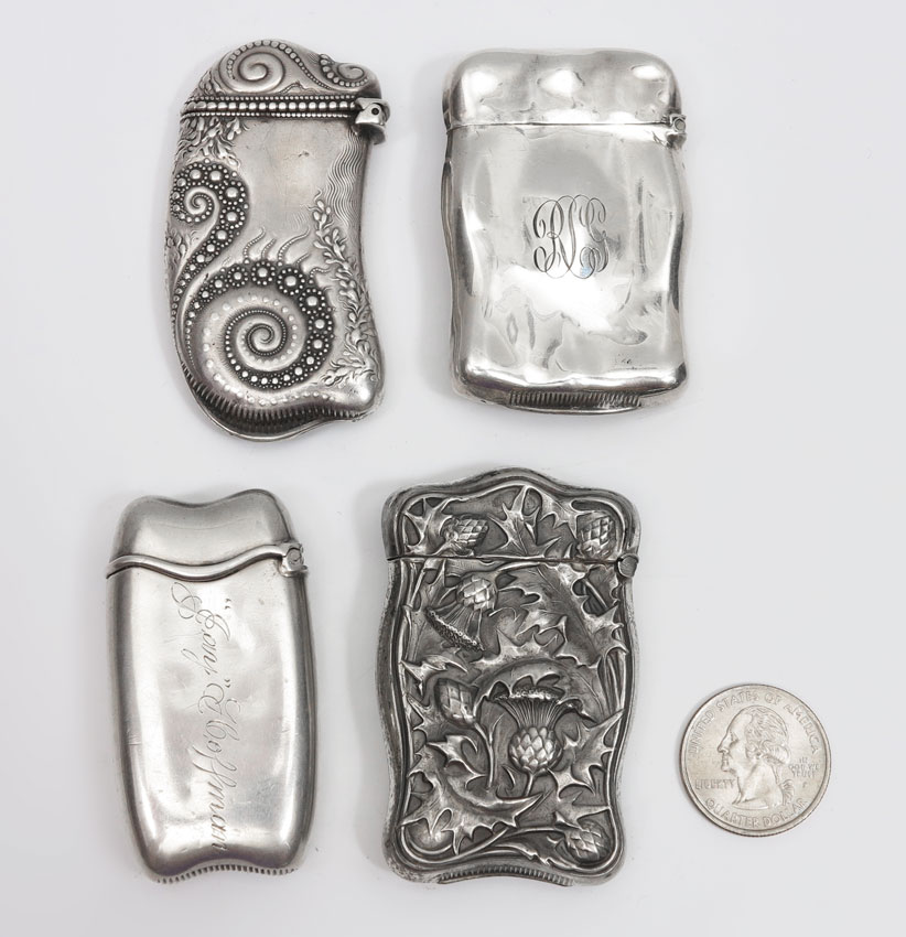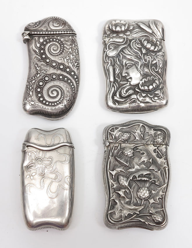 ART NOUVEAU STERLING SILVER MATCH SAFES: To include; 1) Woman's left profile amid flowers and cattails, Unger Bros pattern #8211, vol. 1, page 115, but only marked sterling, monogrammed; 2) Thistles, marked sterling; 3) Flower with swirls, smaller form, curved lip, Whiting, monogrammed and 4) Spirals - nautilus style, Whiting. 3.0 Troy oz.