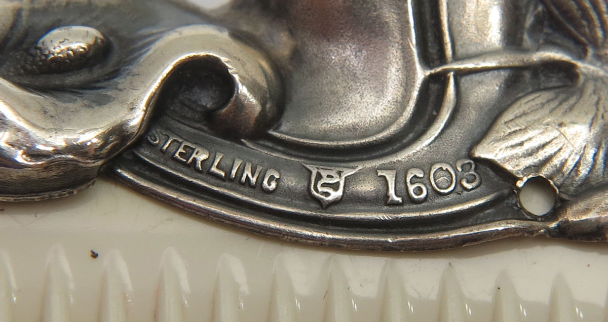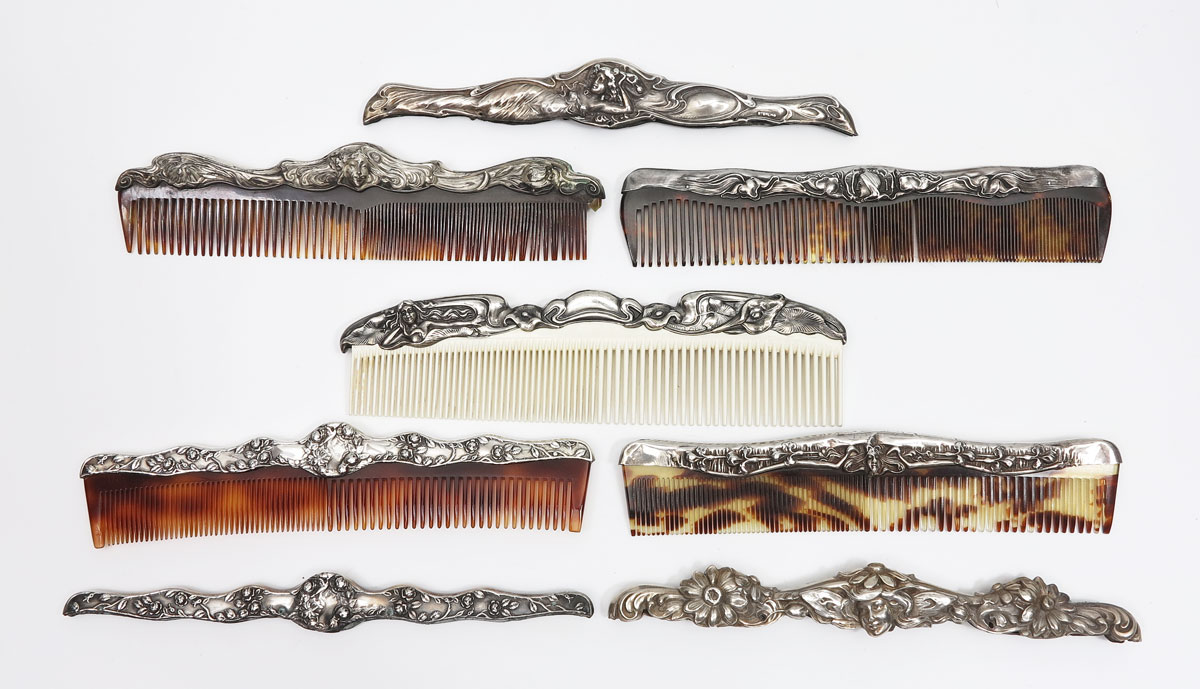 ART NOUVEAU STERLING FIGURAL COMB FRAMES: To include 8 pieces, 3 without combs; includes Unger Bros Art Nouveau Pattern; Unger Bros. woman's head in left profile; butterfly woman by Woodside; woman reclining on left side by Simons Bros, and the rest marked sterling. Longest 7 1/2''.