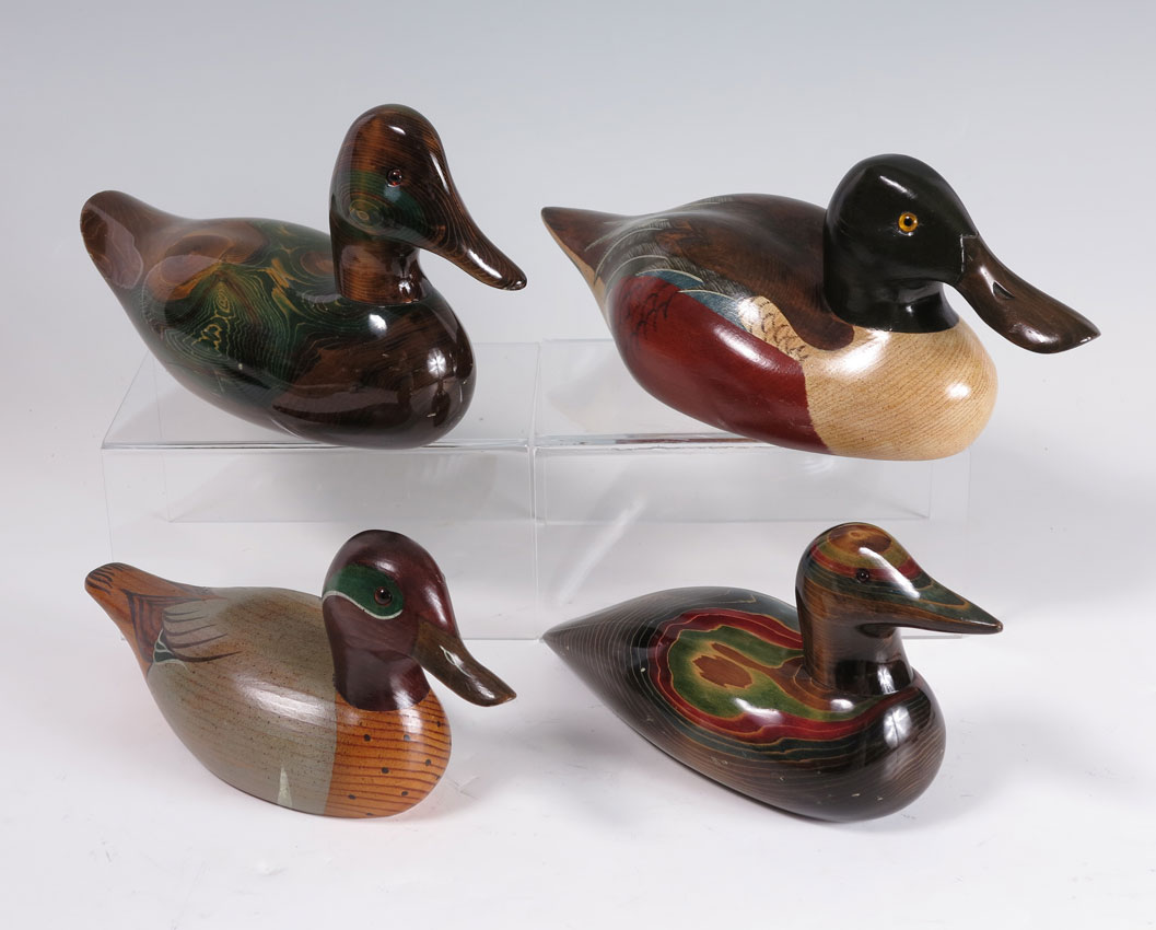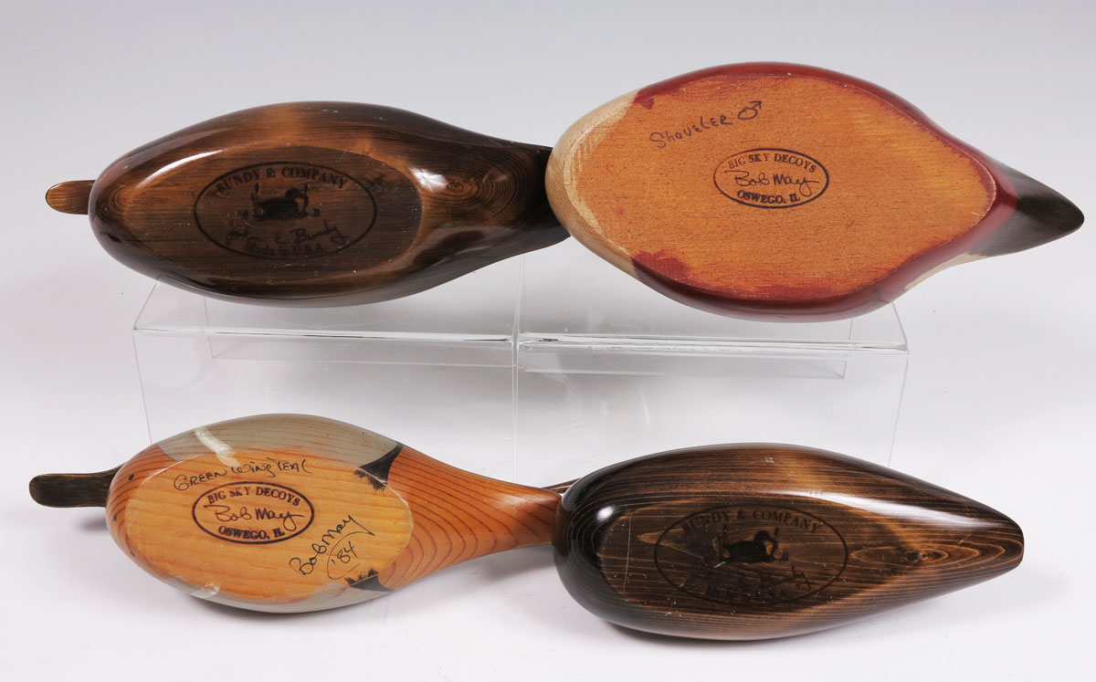 4 DECORATIVE DUCK DECOYS: Two Big Sky Decoys Oswego IL Bob May; 1) Male Shoveler, painted feathers, 5 1/2''h x 13 1/4''l; 2) Green Wing Teal, painted feathers, signed and dated '84, 5'' x 10 3/4''; 3&4) Two Bundy & Company ducks, 6 1/2'' x 12 1/4'' and 5'' x 10 1/4''. Both with clearcoat over enhanced wood grain motif. All with plastic eyes. Sold as a lot.