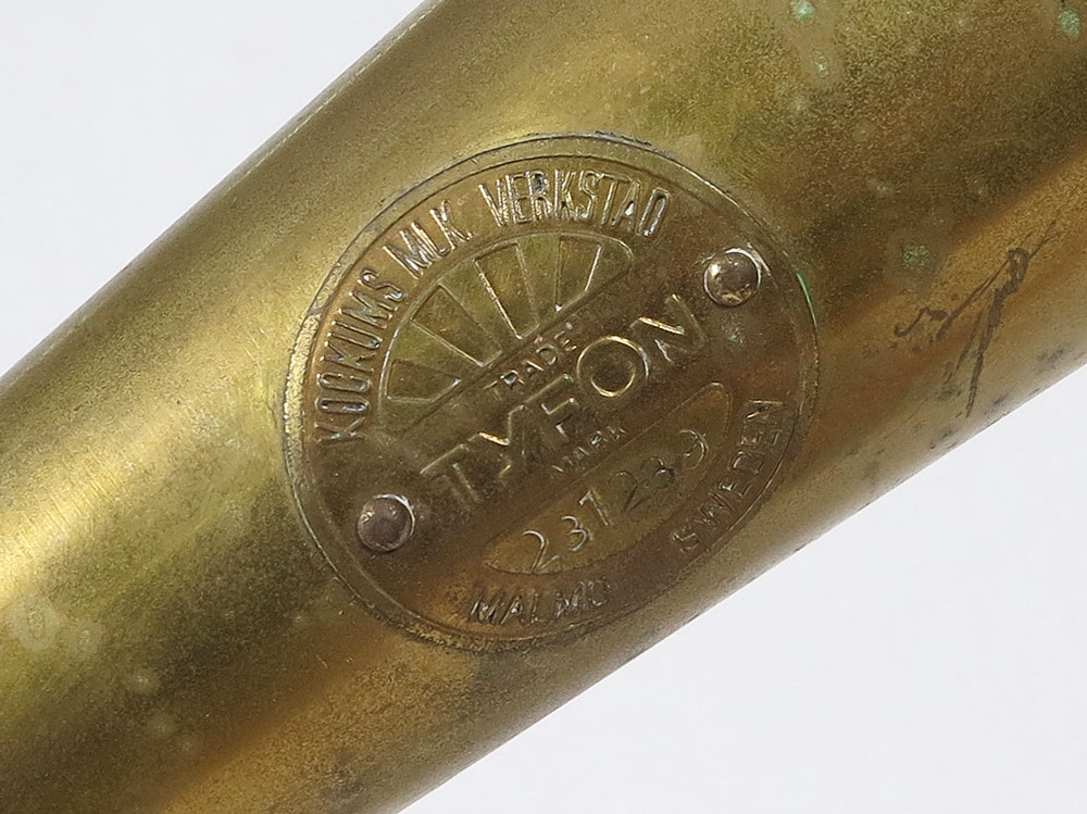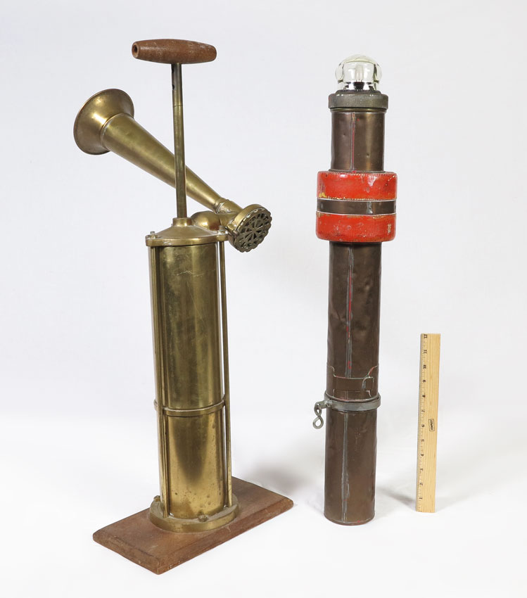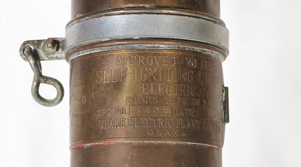 2 PIECE NAUTICAL SHIPS HORN & EMERGENCY BUOY LIGHT: To include 1) Swedish Tyfon ships fog horn mounted to wood base, bellows working. 23 1/2'' h. x 13'' x 6 1/2''. 2) Otake Type 2 Self Igniting Light, serial 6438, dated June 1970. 29 1/2'' l. x 5''.