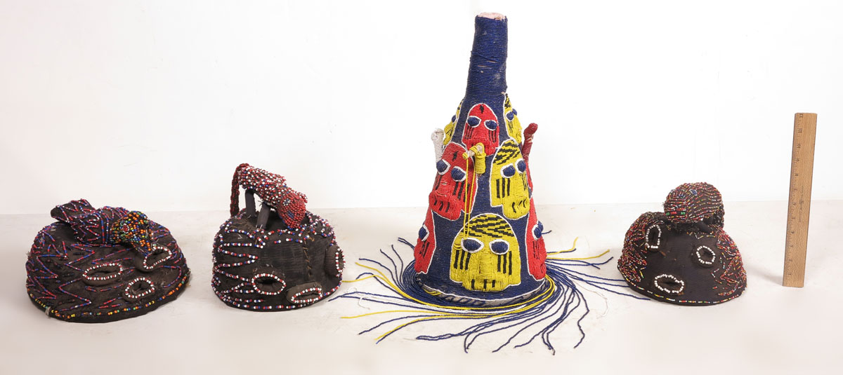 4 CARVED AFRICAN CAMEROON BEADED HATS