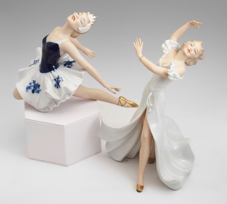 TWO WALLENDORF PORCELAIN FIGURINES: 1) Ballerina, 7 1/2'' h. x 10''. 2) Lady in flowing dress, 9 3/4'' x 6 1/2''.
