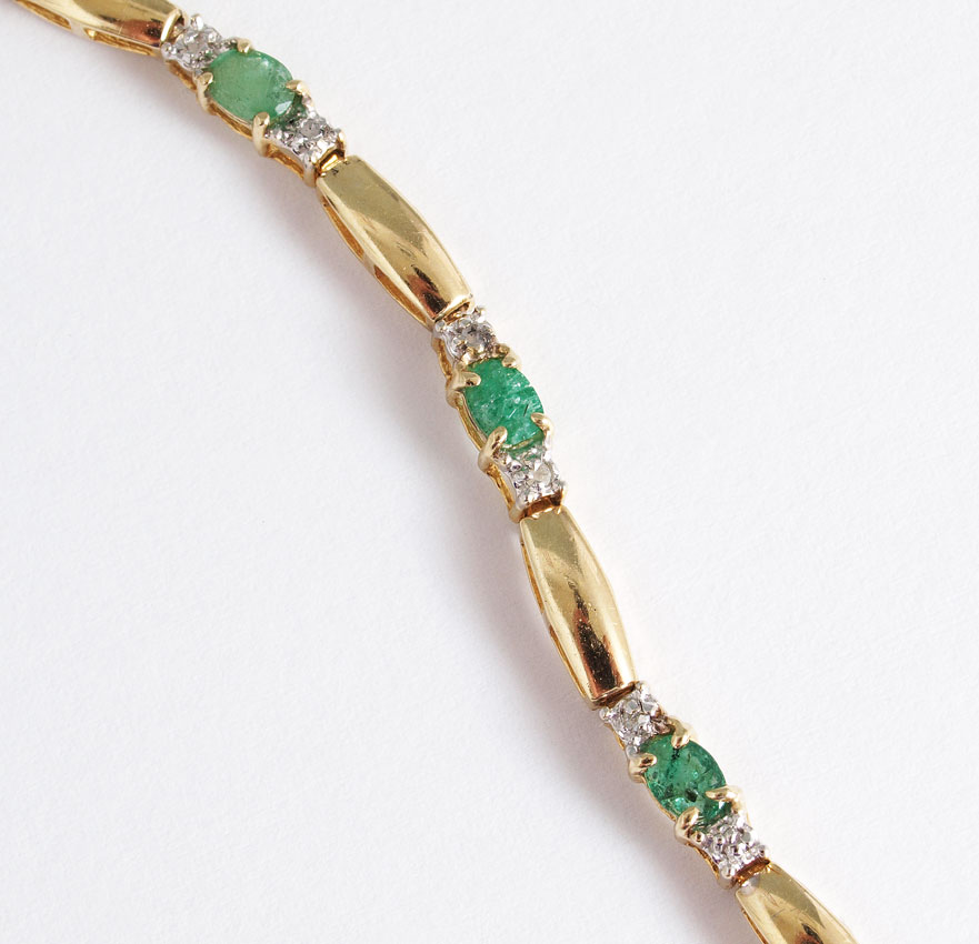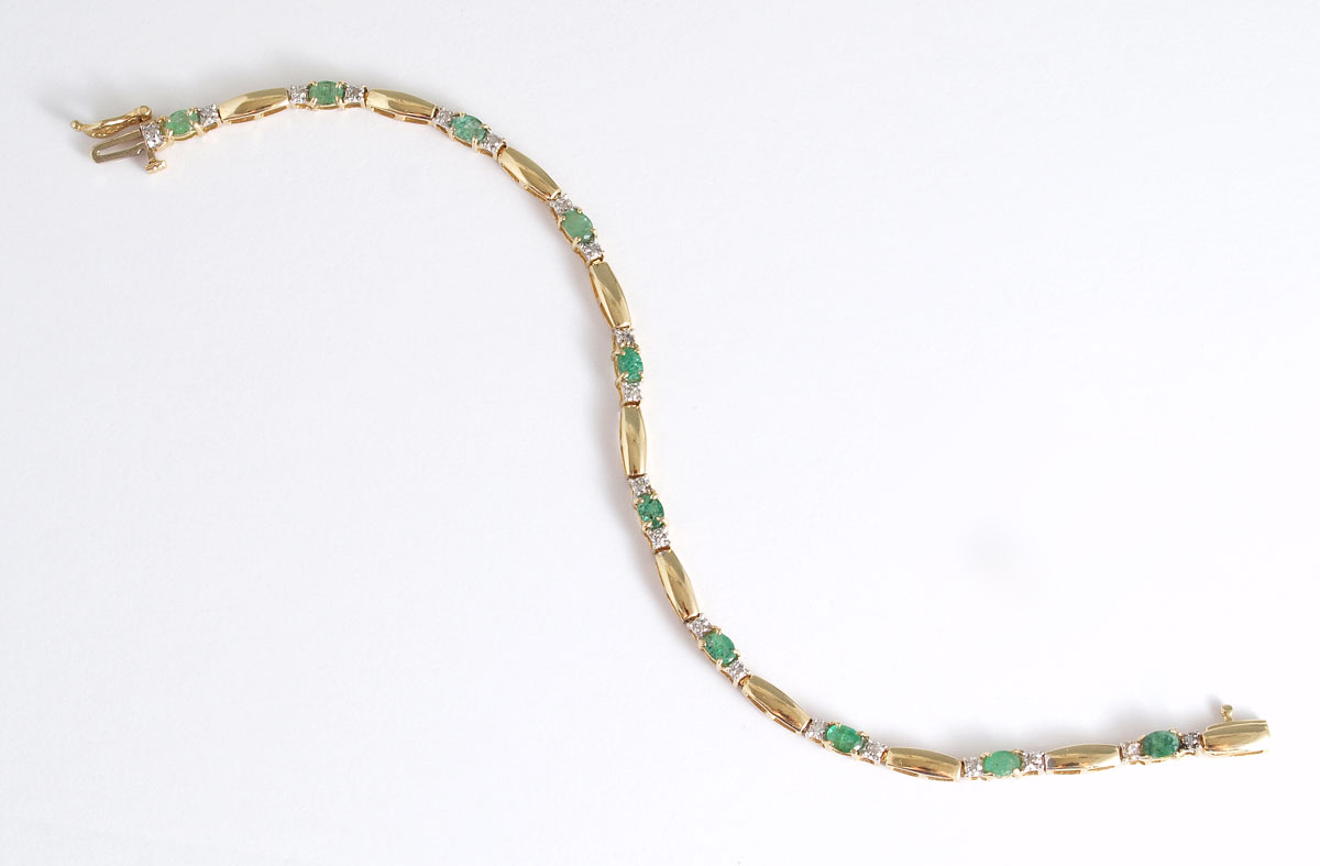 14K EMERALD & DIAMOND BRACELET: 14K yellow gold bracelet contains 10 oval faceted emeralds. Weight: 2.00 Ct. Approx. 20 round single cut diamonds. Weight: .25 Ct. Approx. The emeralds and diamonds are prong set. Locking closure with figure eight safety clasp. Weight: 6.8 grams. Length: 7''