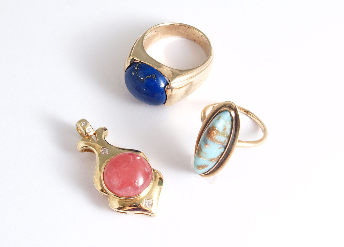 3 PIECE GOLD RINGS AND PENDANT: All 14K yellow gold. 1) Lapis ring, sz 6.5. 2) Pyrite turquoise ring, size 4.5. 3) Rhodochrosite and CZ pendant. Total weight 19 grams.