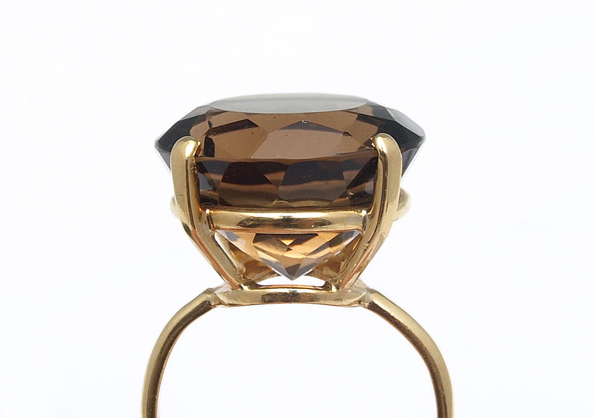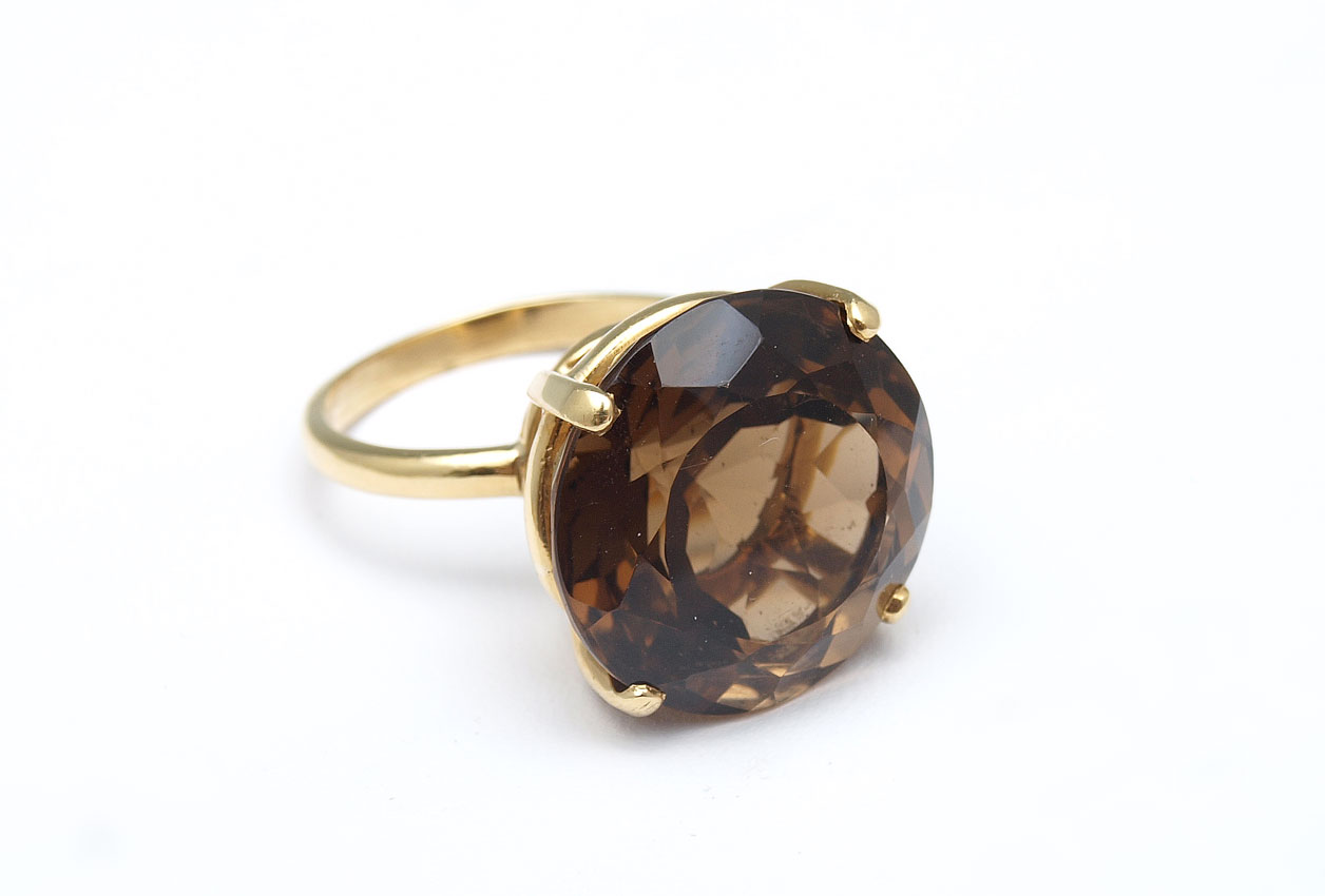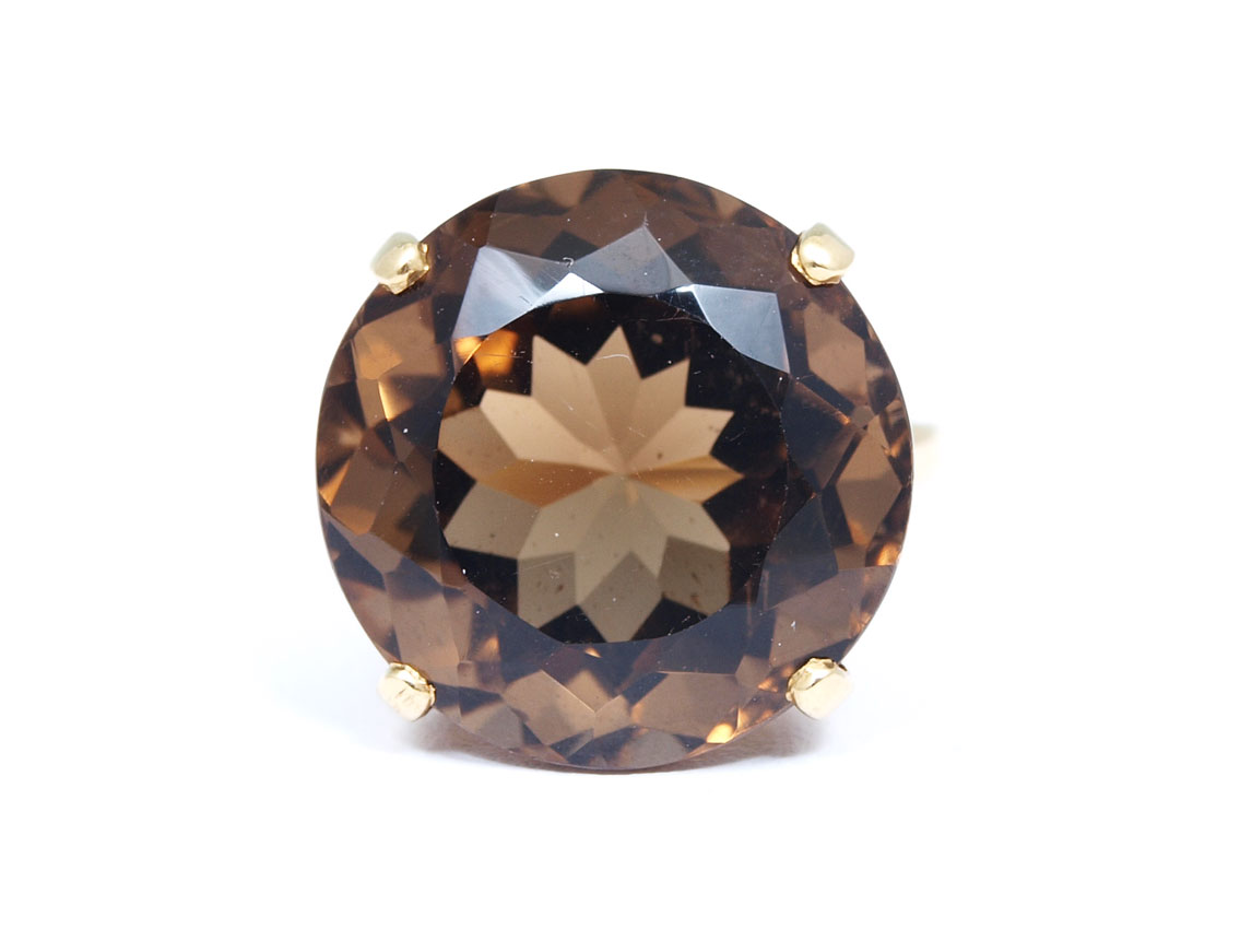 13 CT SMOKY QUARTZ RING: 14K yellow gold ring contains one round faceted smoky quartz, rich brown color. Weight: 13.00 Ct. Approx. The quartz is prong set. Weight: 7.2 grams Size: 6.5