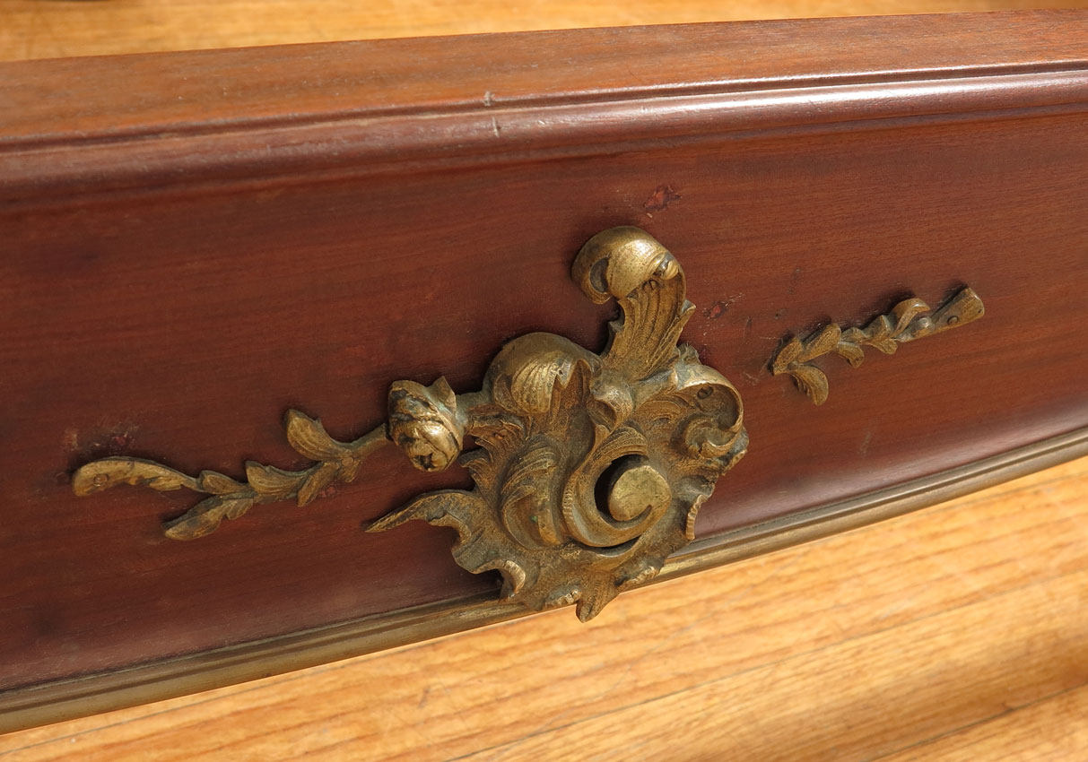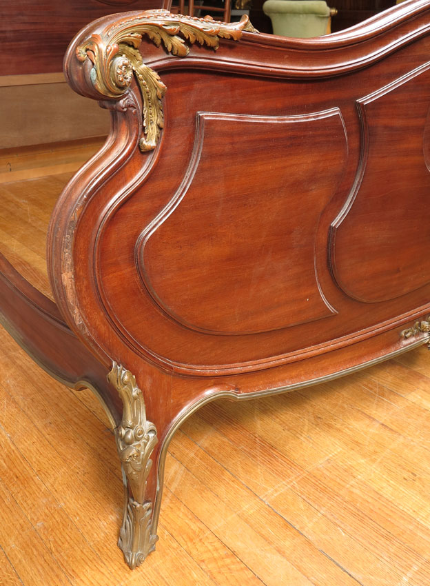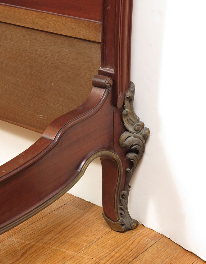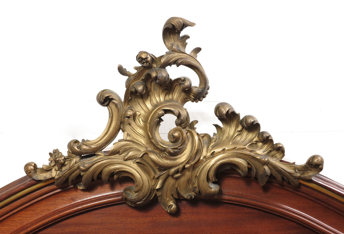 FRANCOIS LINKE QUALITY FRENCH ORMOLU BED: Carved and shaped head board and foot board with applied ormolu decoration, foot board with additional foliate and arrow decoration. Head board 64 1/2'' h. x 67'' x 4'', foot 33'' x 67'', rails 76 1/2'' l.