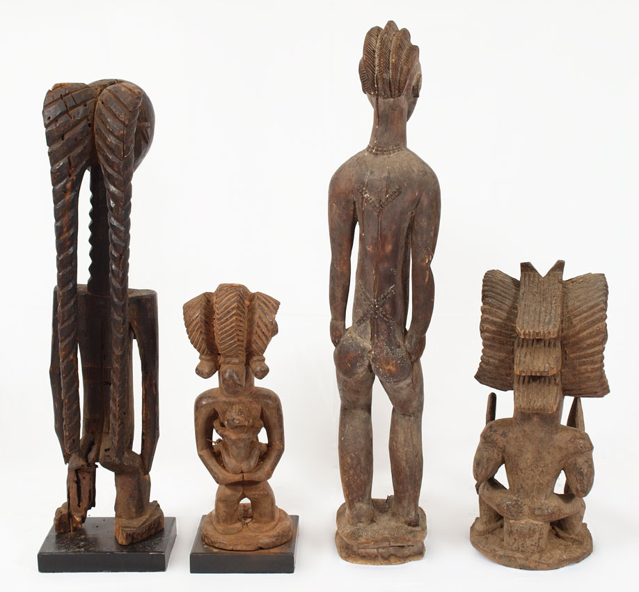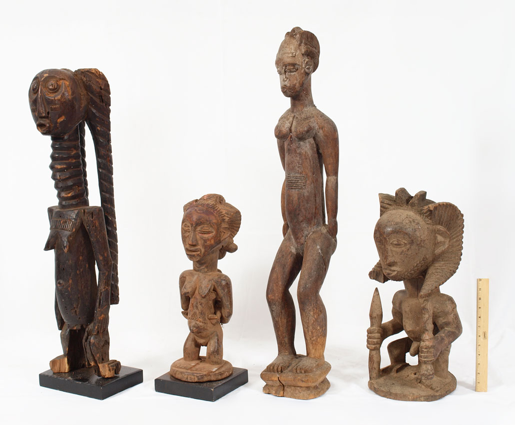 4 MIXED CARVED AFRICAN FIGURINES: 22'' x 9'' x 11'', 14 lbs., 21'' x 7 1/2'' x 7 1/2'', 7 lbs., 38'' x 9'' x 9'', 12.5 lbs., & 38'' x 6'' x 9''.