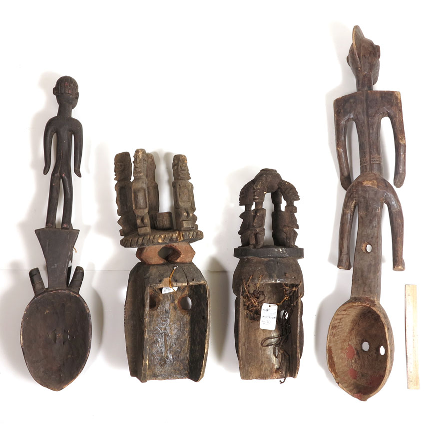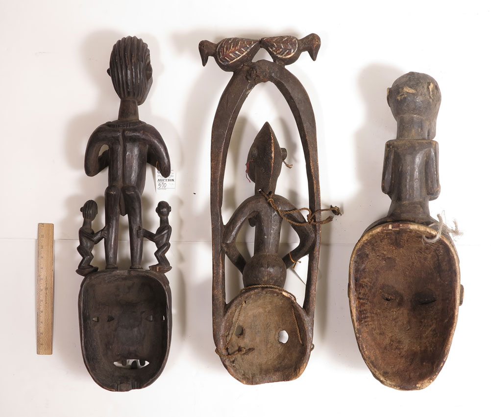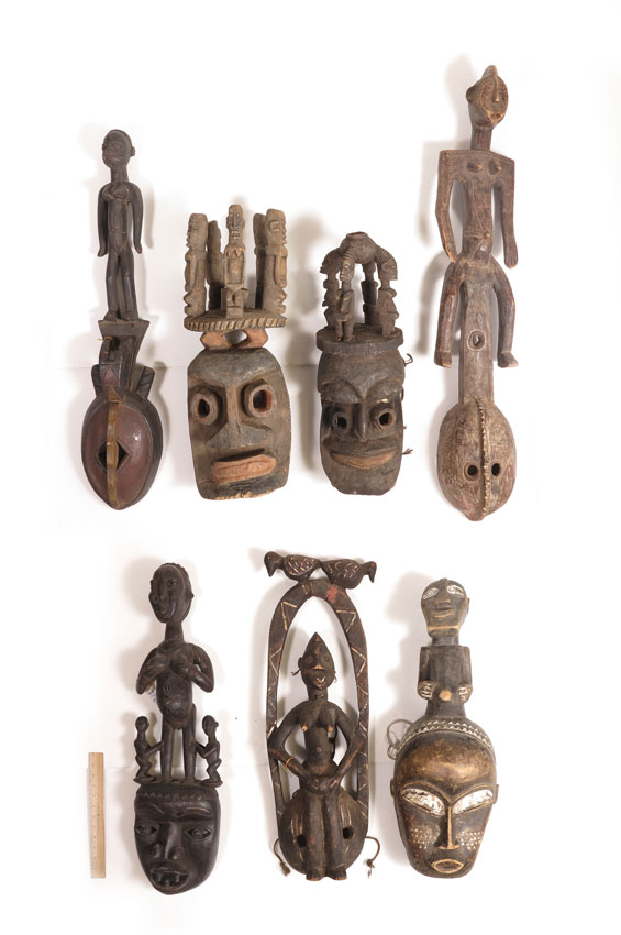 7 CARVED AFRICAN FIGURAL MASKS: 26'' x 10'' x 9'', 11 lbs., 43'' x 8'' x 6'', 6 lbs., 36'' x 8'' x 5'', 2 lbs., 24'' x 8'' x 8'', 6 lbs., 31'' x 8'' x 5'', 7 lbs., & 27'' x 10'' x 8'', 6 lbs.