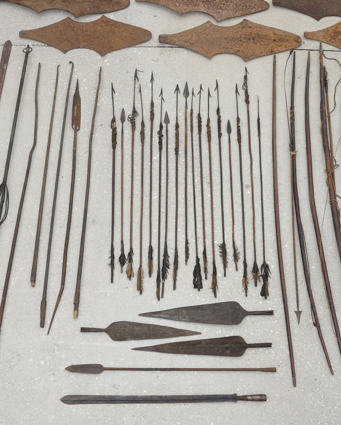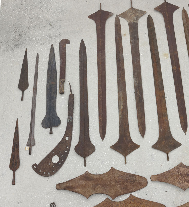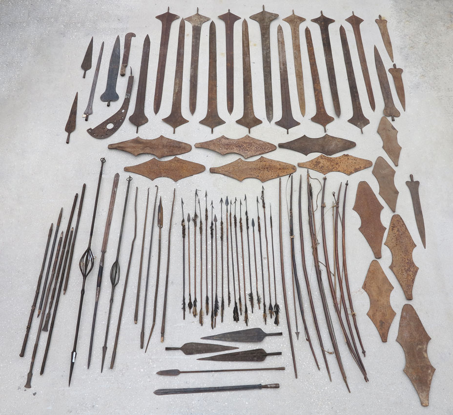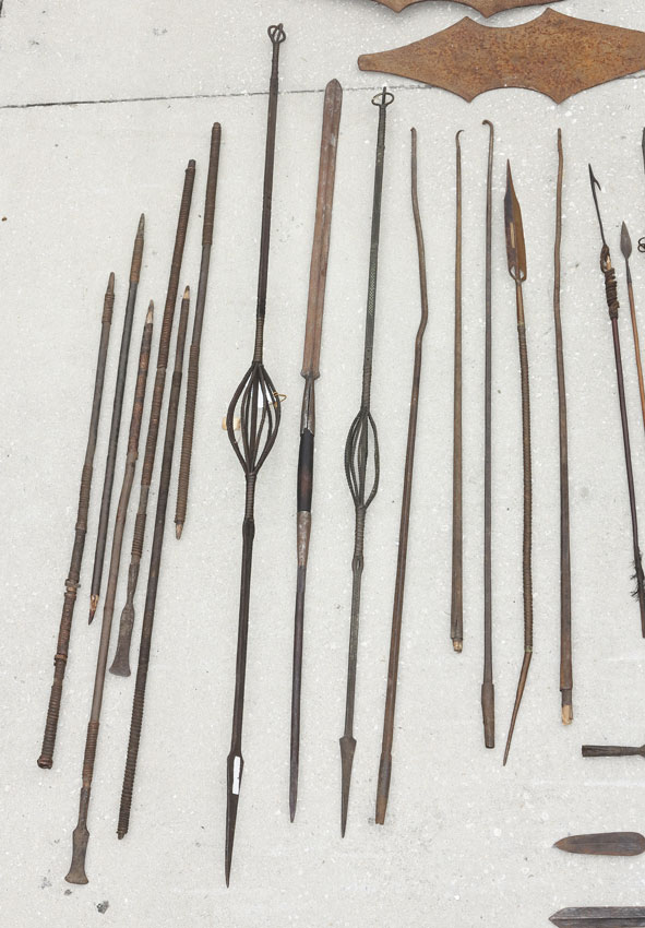 CARVED AFRICAN SWORDS, 15 SPEARS, 17 ARROWS, 25 SPEARHEADS, 14 LONG SPEAR BLADES, AND 7 BOWS: Longest Spear is 6ft.