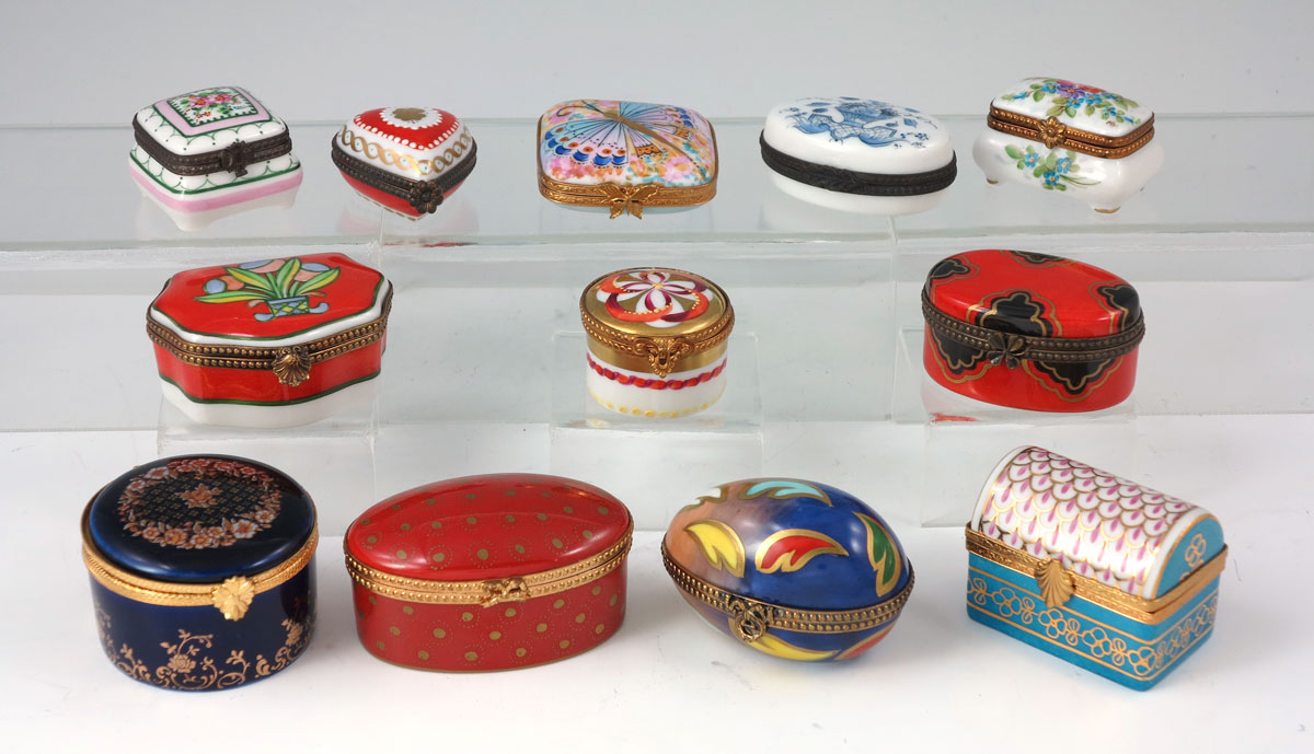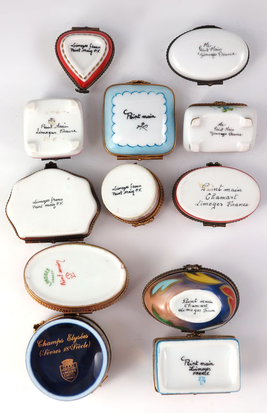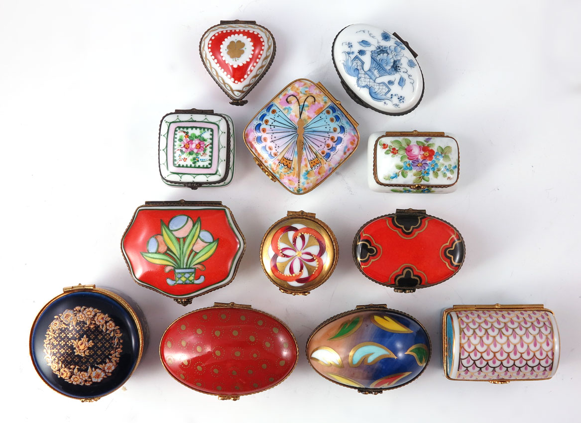 A DOZEN FRENCH LIMOGES PEINT MEIN MINIATURE BOXES: Hinged top, hand painted porcelain boxes in the shape of an egg, sarcophagus, round, treasure chest, oval and a heart. The smallest being 1'' x 1.2''. The largest, 1.25'' x 2.25''.