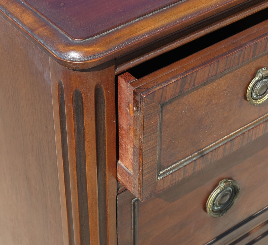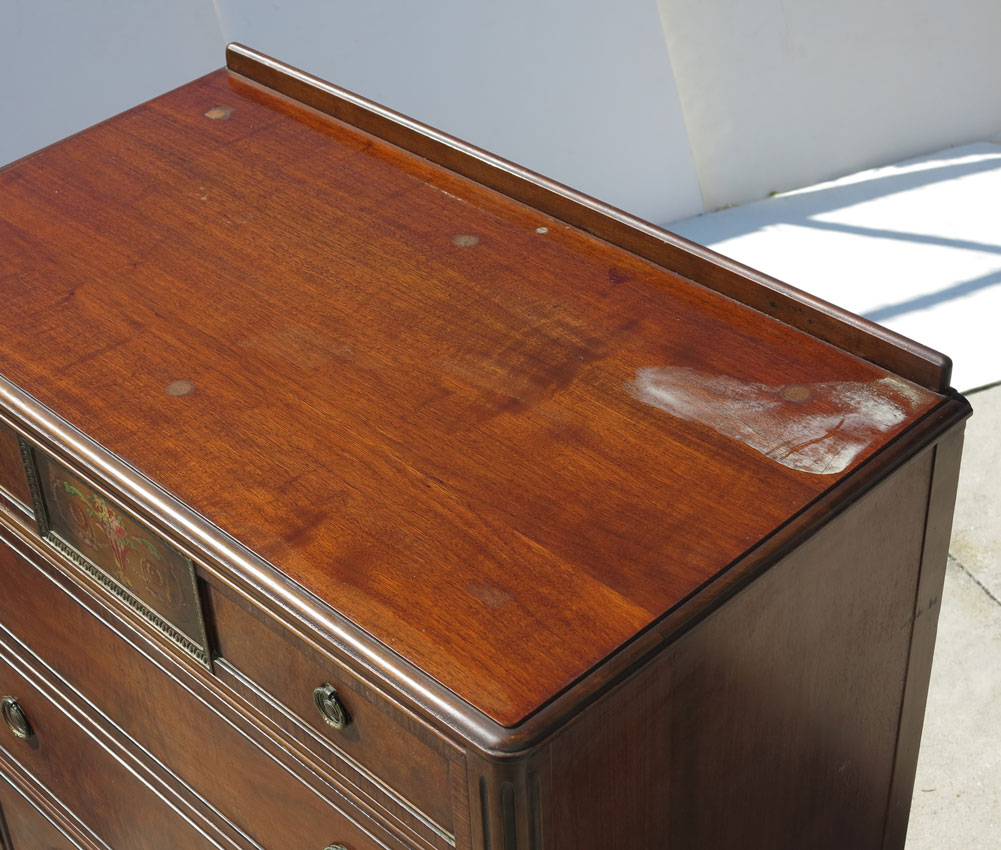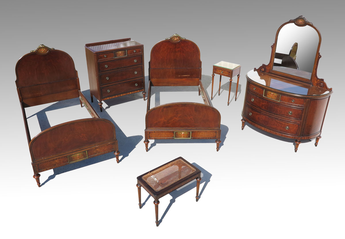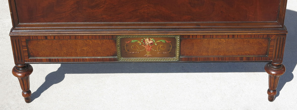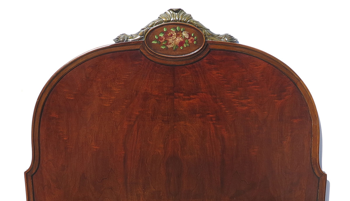 BERKEY & GAY 5 PIECE PAINT DECORATED BEDROOM SUITE: Floral paint decorated panels, to include 2 twin BEDS (headboard 51'' h. x 41 3/4'', foot board 31 1/4'' h., rails 76'' l.), 4 drawer CHEST (46 1/2'' x 38 1/4'' x 21''), 3 drawer demi lune CHEST with glass top and mirror (overall 73'' h. x 50'' x 22 1/4''), single drawer NIGHT STAND with glass top (29 3/4'' h. x 17 1/2'' x 13'').