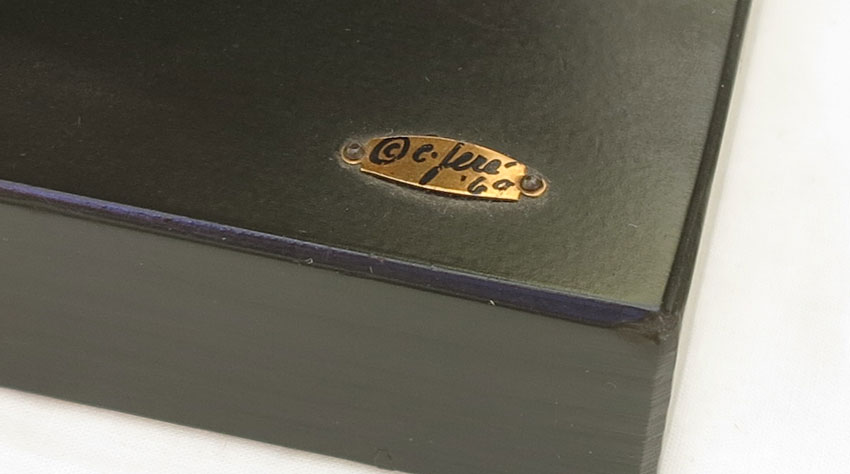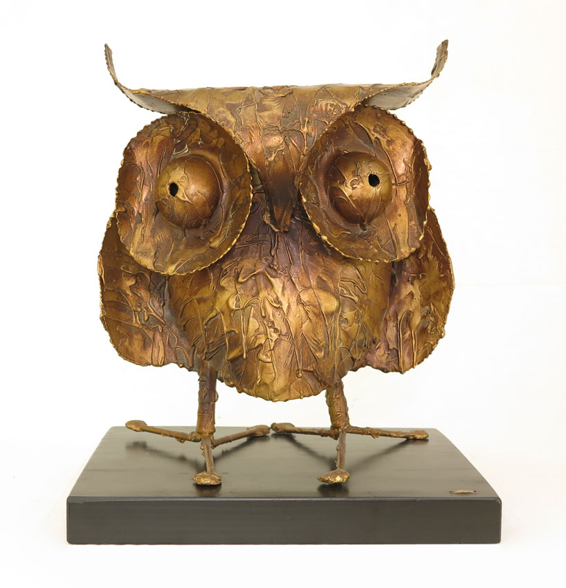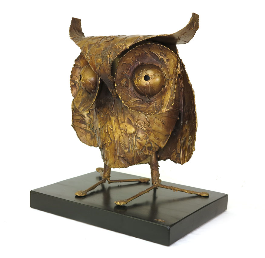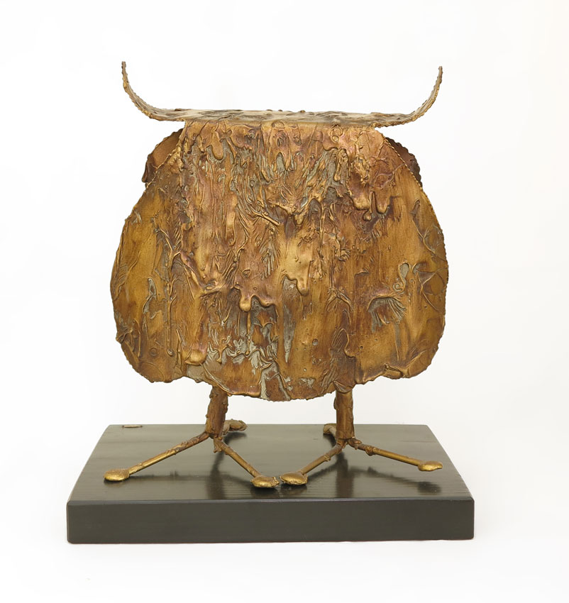 CURTIS JERE OWL SCULPTURE: Signed on base C. Jere and dated '60. 15 1/4'' h. x 13'' x 8 1/2''. Sold with wood stand also signed and dated '60, 1 1/2'' x 14'' x 11''.