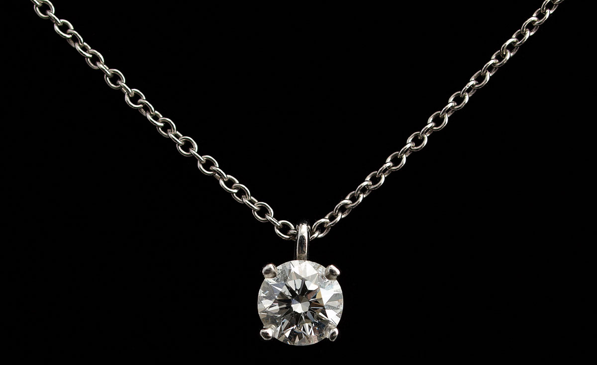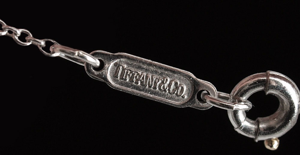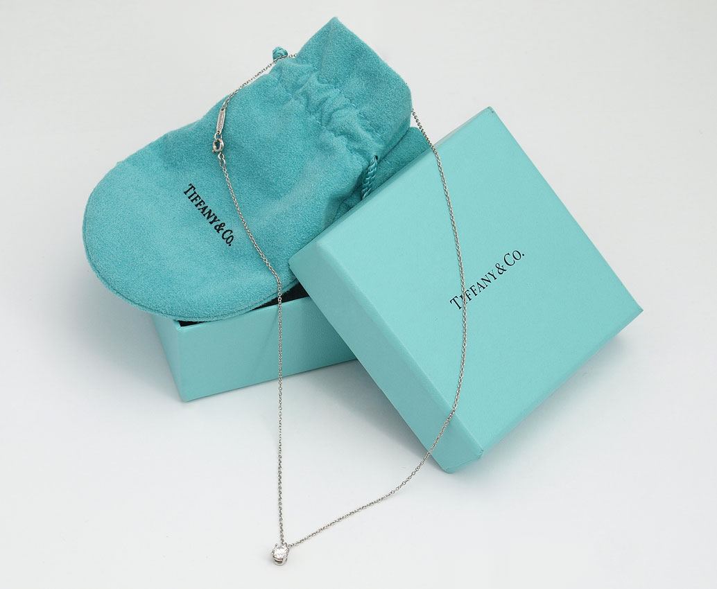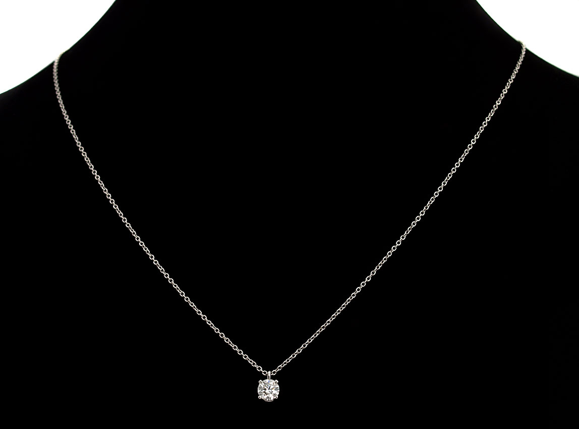 PLATINUM TIFFANY & CO DIAMOND SOLITAIRE PENDANT NECKLACE: Understated elegance. A single .45 Ct diamond suspended from a platinum chain. The diamond is VS1 in clarity and F-G color. Chain measures 16''. Sold in the Tiffany & Co. pouch and outer box.