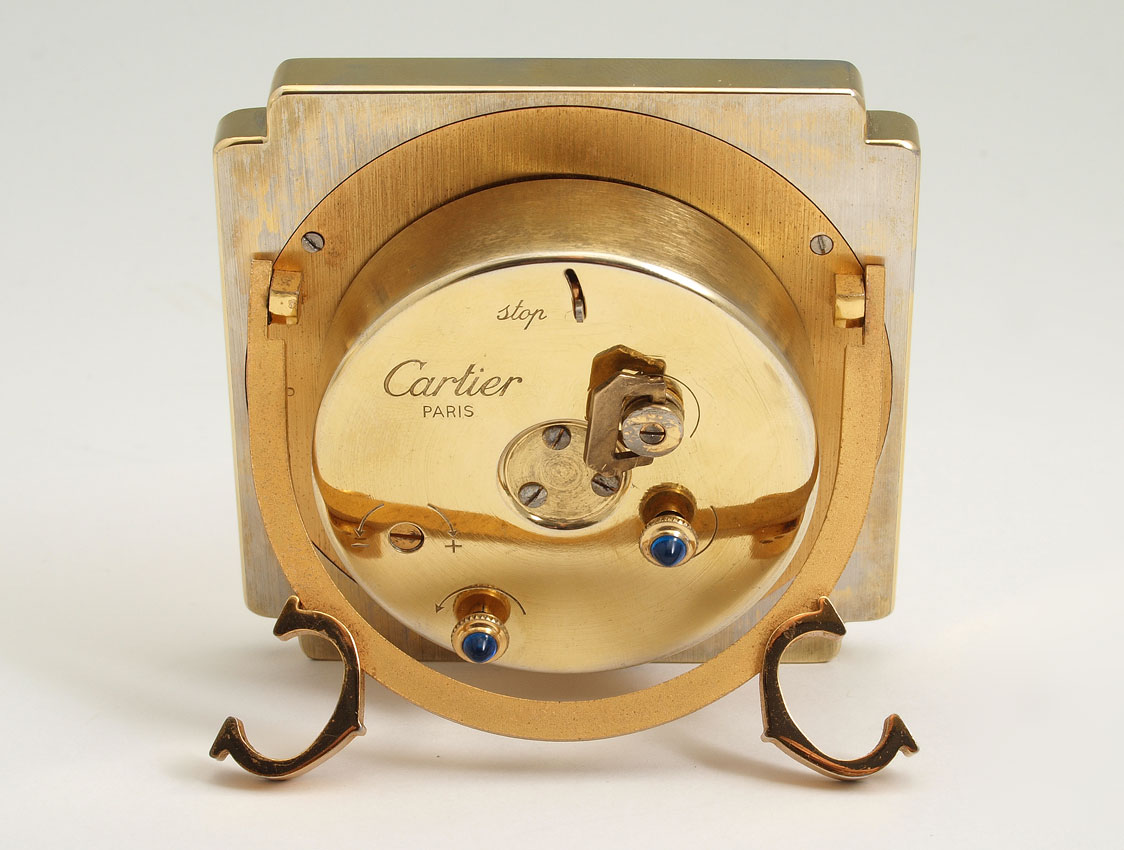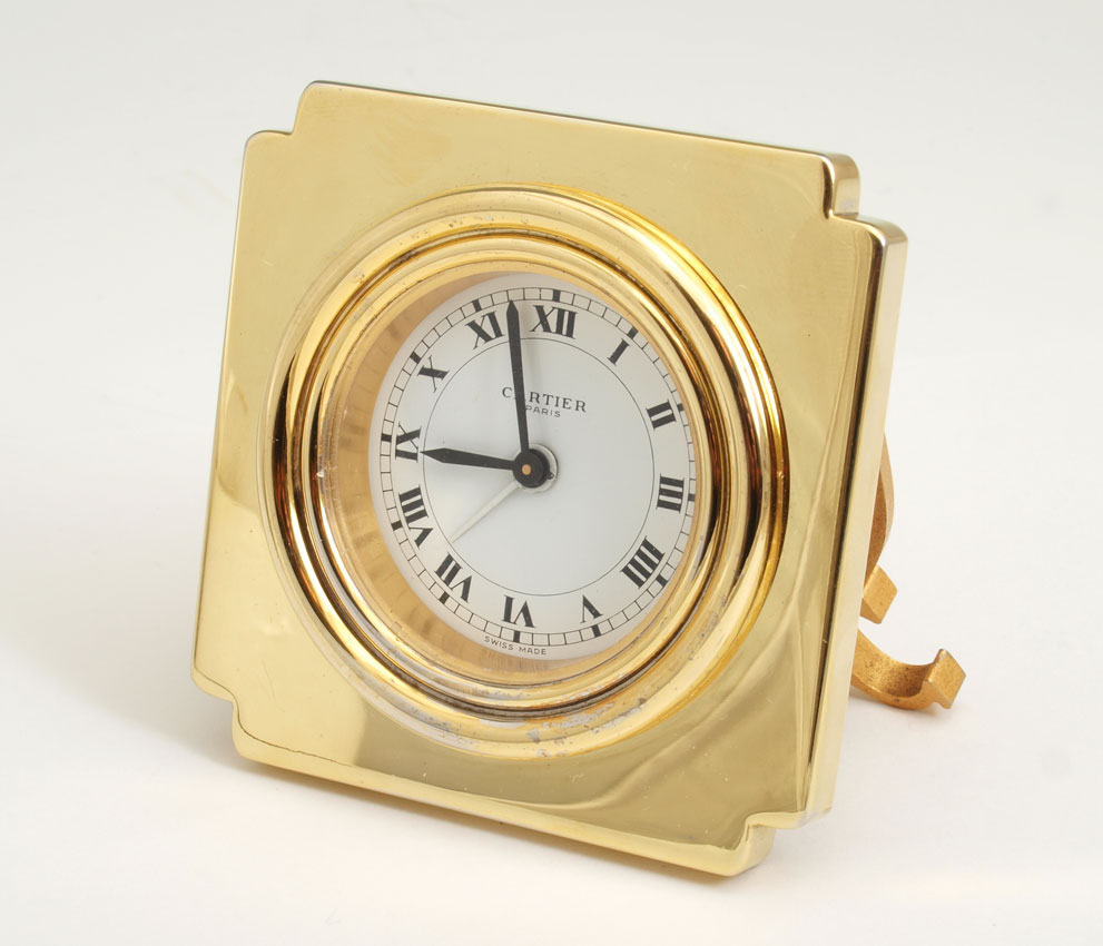 CARTIER LES MUST TRAVEL CLOCK IN CASE: Brass case clock with alarm, 3'' square. Sold with original embossed red leather box, 2'' h. x 4 1/4'' x 4 3/4''.