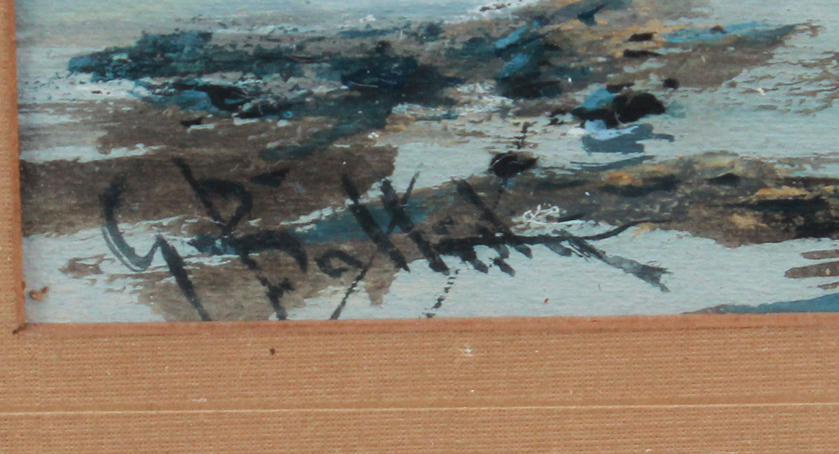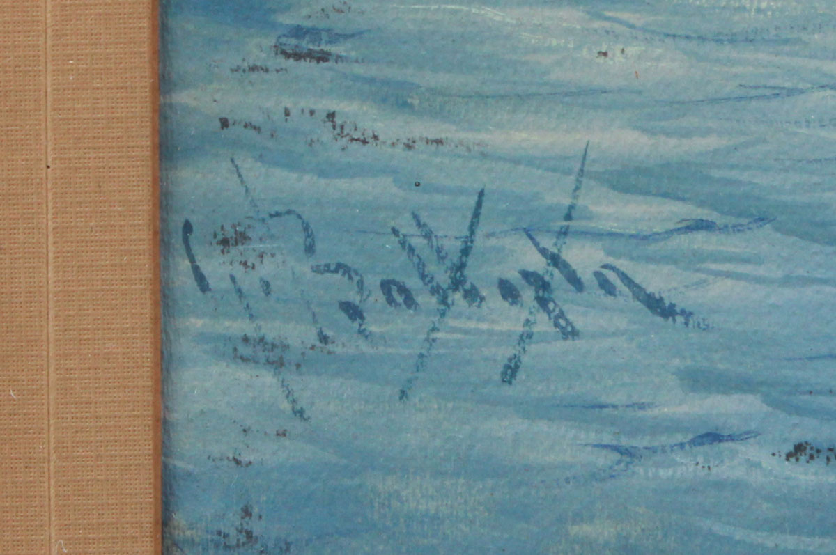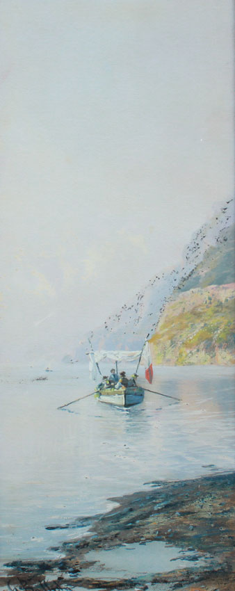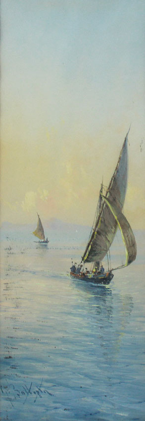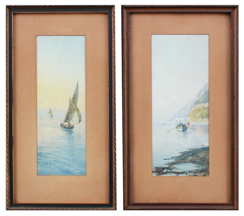 BATISTA, Giovanni, (Italian, 1696-1770): 1) Day Cruise on the Coast, Watercolor/Gouache, Sight size 14 1/4'' x 5 3/4'', signed lower left, carved and gilded period frame, 20 1/2'' x 11 1/2''. 2) Sailing Ships on the Bay of Naples, Watercolor/Gouache, Sight size 14 1/4'' x 5'', signed lower left, gilded frame with wear, 21'' x 11 1/4''.