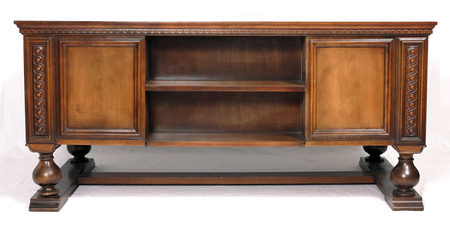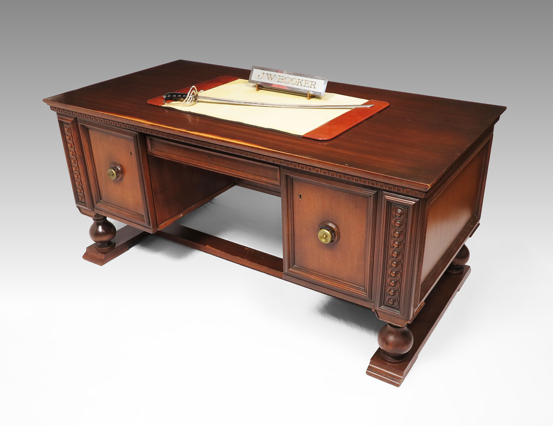 SERGEANT MAJOR JAMES W. BOOKER'S DESK: Sold with his Model 1902 sword, name plate and blotter. Desk with single central drawer with 2 side doors, carved accents. 30 1/4'' h. x 67 1/4'' x 33 3/4''. Sword presented to Booker by the Sergeants Major Association in 1978, Presidio, San Francisco.